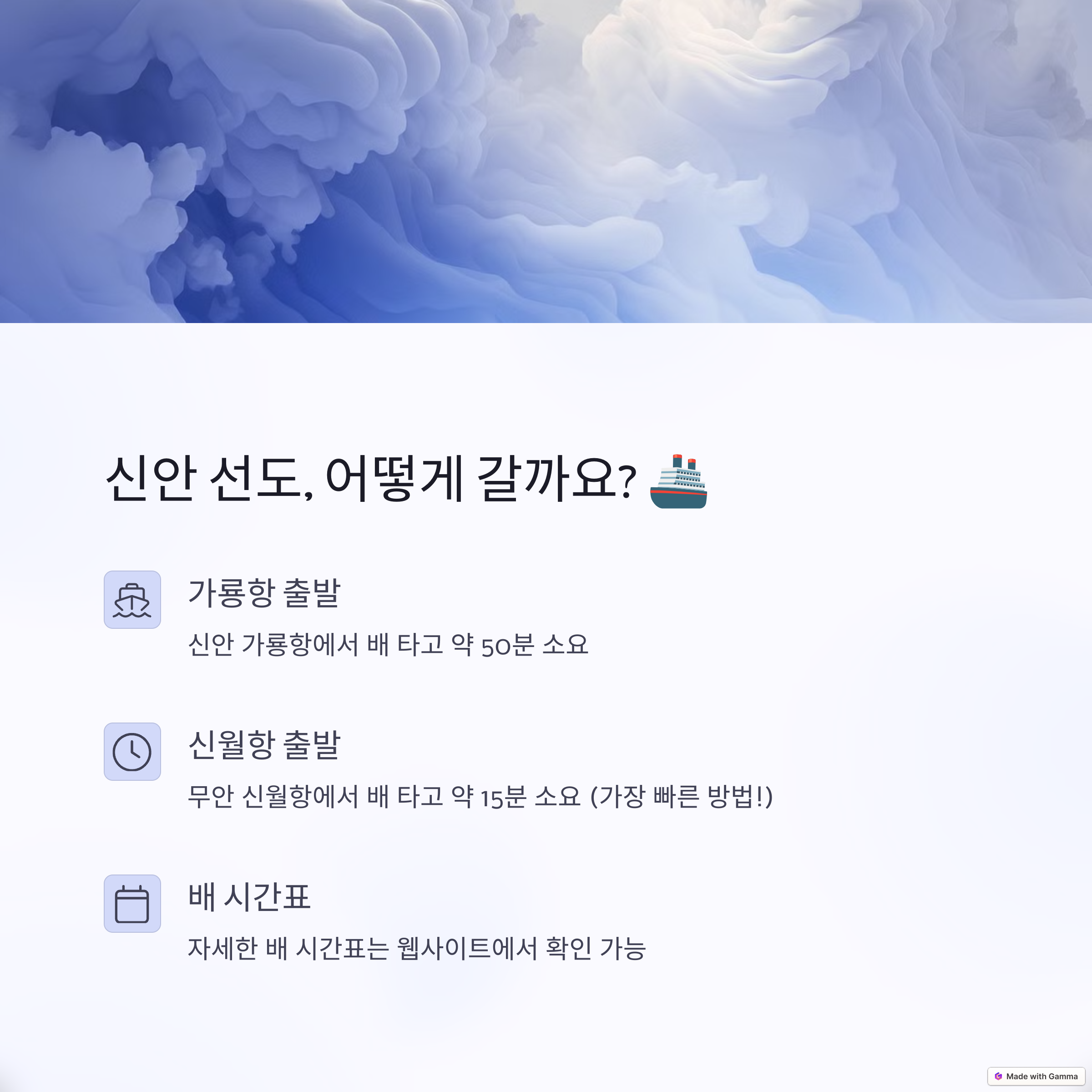 위치 및 접근 방법 전라남도 신안군 지도읍 선도리, 가룡항 또는 신월항에서 배편 이용