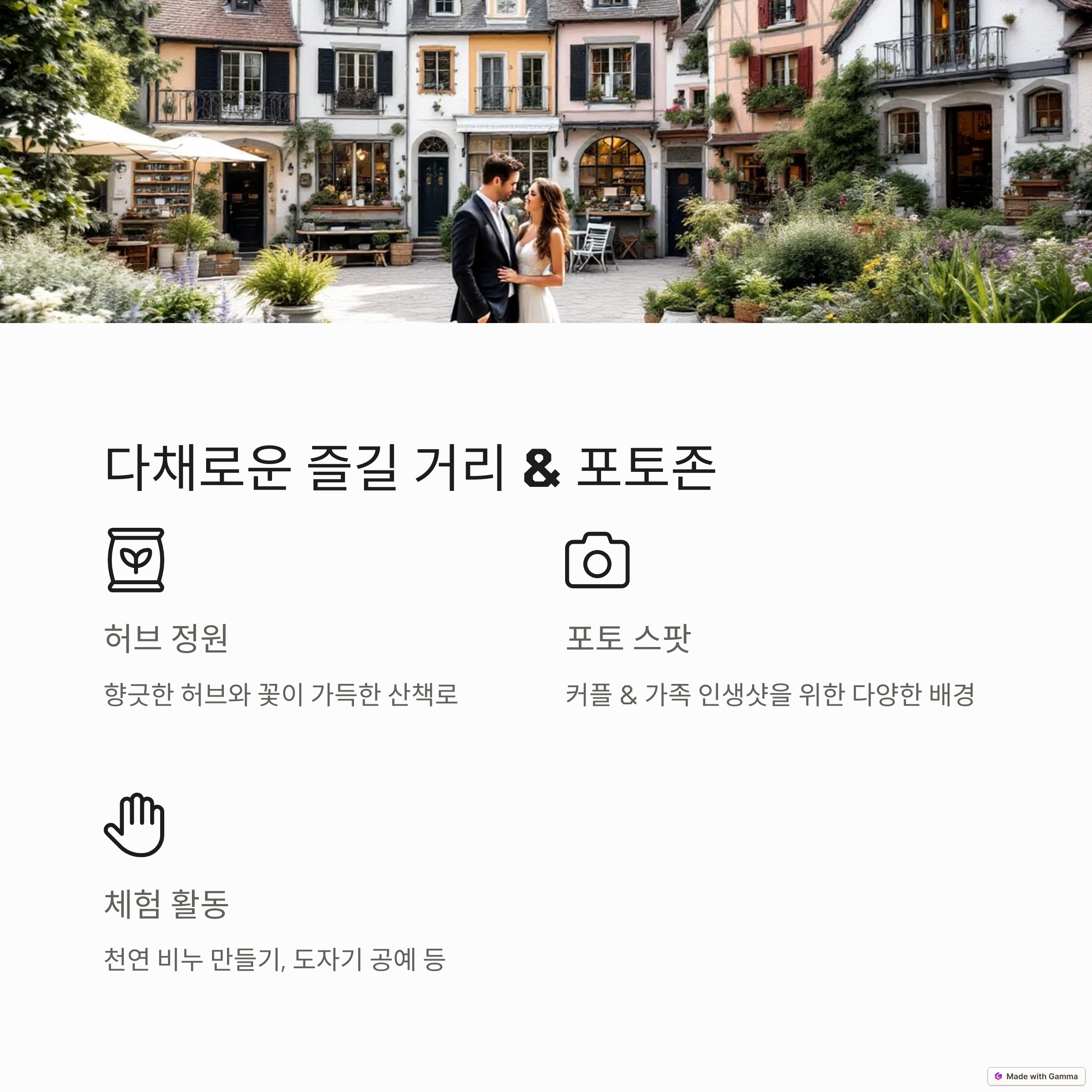 이곳에서는 유럽풍 레스토랑과 베이커리, 허브 공방, 도자기 체험 등 다양한 프로그램을 즐길 수 있습니다. 게다가 입장료가 무료라는 점도 큰 장점이며, 근처에 위치한 헤이리 예술마을, 통일동산 관광특구, 파주 아울렛 등 함께 둘러볼 수 있는 명소가 많아 여행 계획 짜기에도 용이합니다. 하루 일정으로 다녀오기에도, 주말 나들이로도 손색없는 최고의 장소입니다.