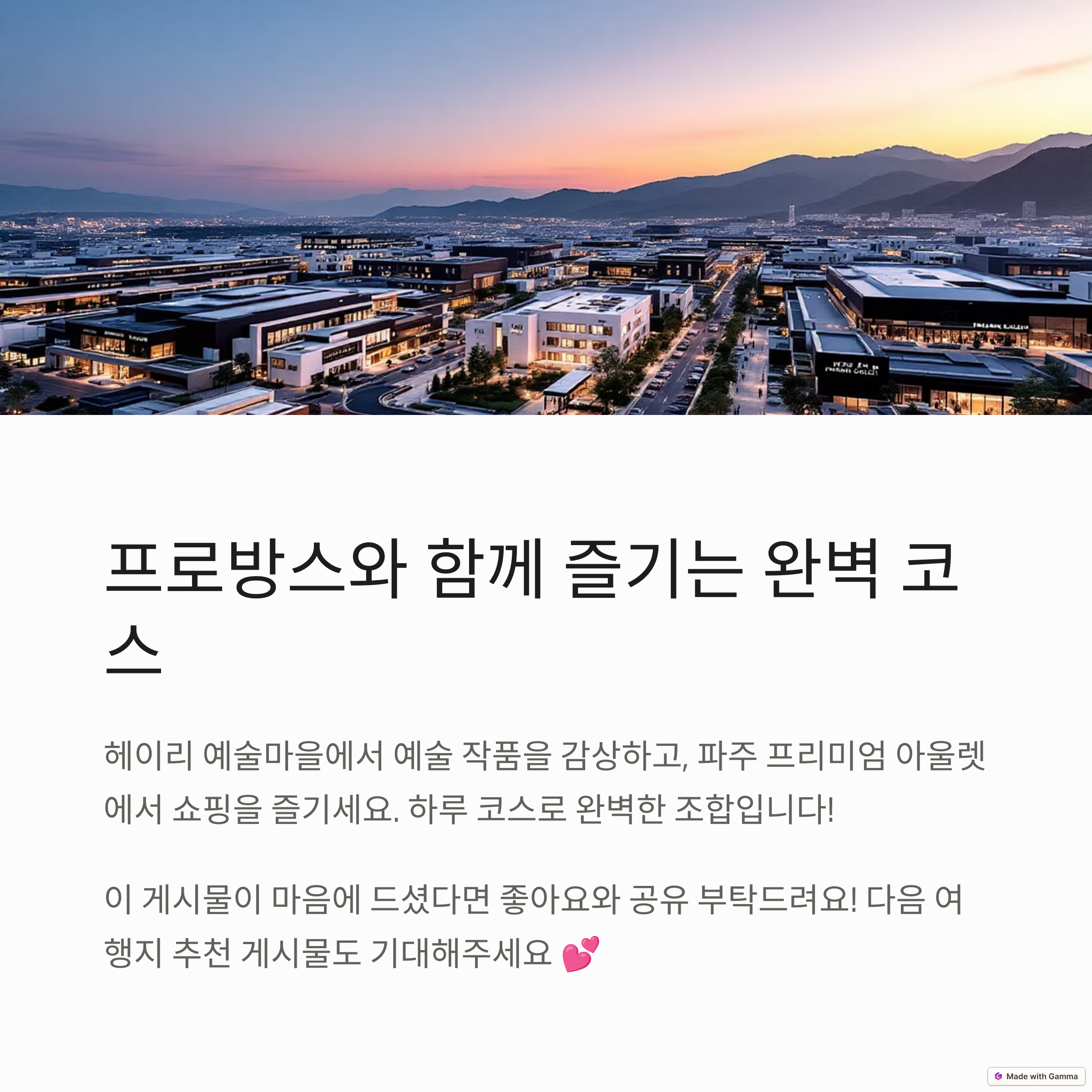 파주 프로방스 마을은 단순한 관광지가 아닌 감성과 분위기를 동시에 느낄 수 있는 특별한 공간입니다. 낮에는 파스텔 감성 건축과 감성적인 포토존이, 밤에는 로맨틱한 조명이 여행의 감동을 배가시켜줍니다. 여기에 더해 다양한 체험 활동과 맛있는 음식까지 갖춰져 있어 하루 일정으로도 충분한 만족을 느낄 수 있습니다. 잊지 못할 여행을 계획하고 있다면, 프로방스 마을을 꼭 한 번 방문해보세요.