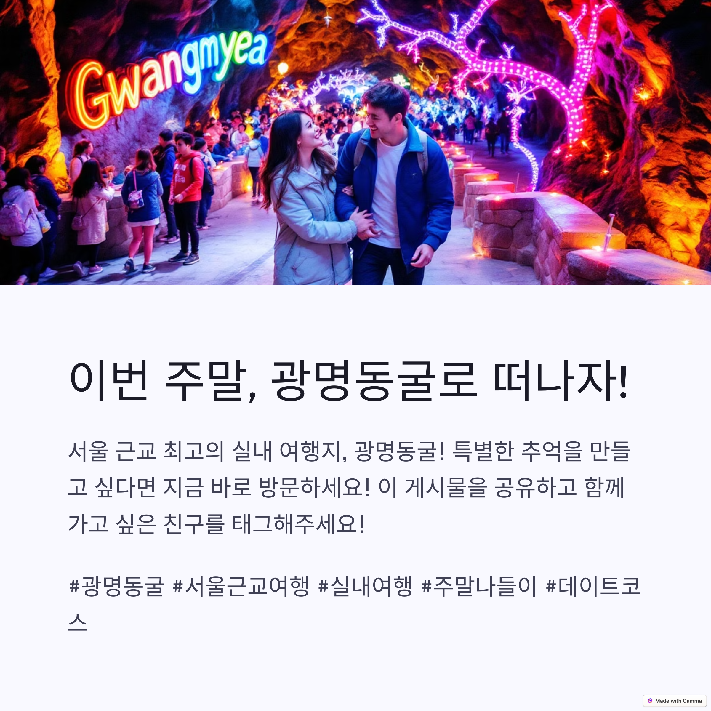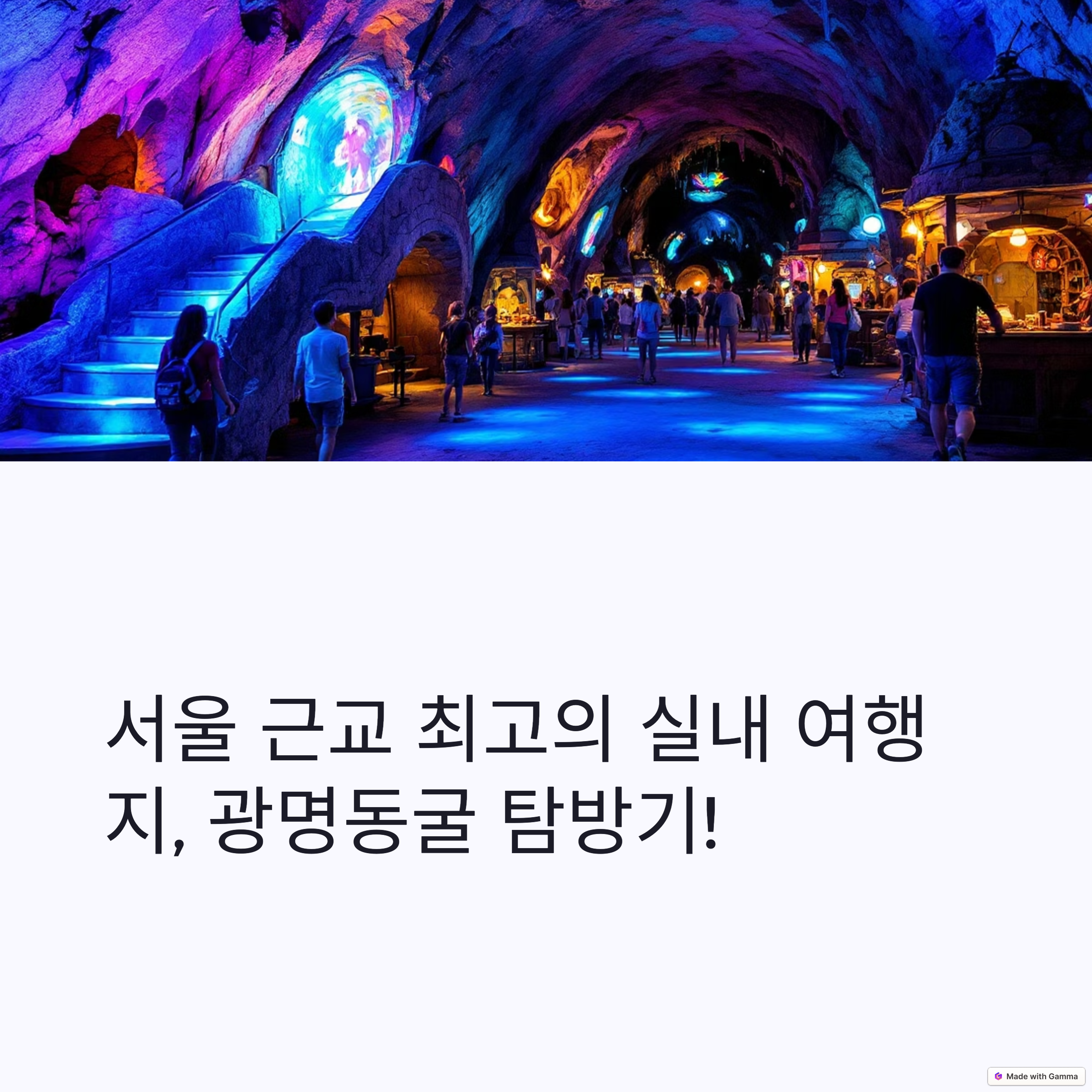 | 와인 터널, 미디어아트, 역사 전시 | 연중 운영, 입장료 저렴, 동굴 내부 기온 12도 | 광명전통시장, 아트센터, 광명스피돔 |