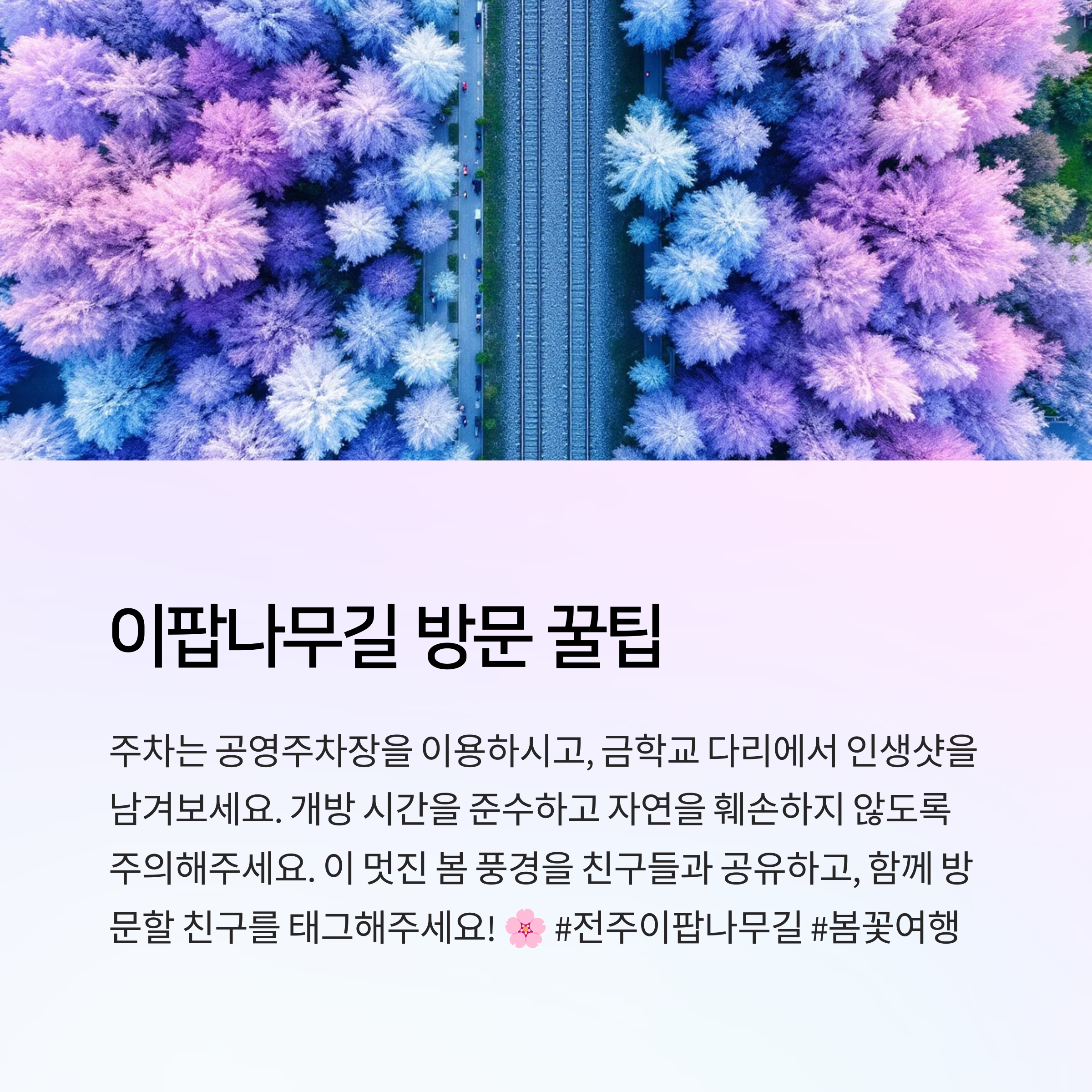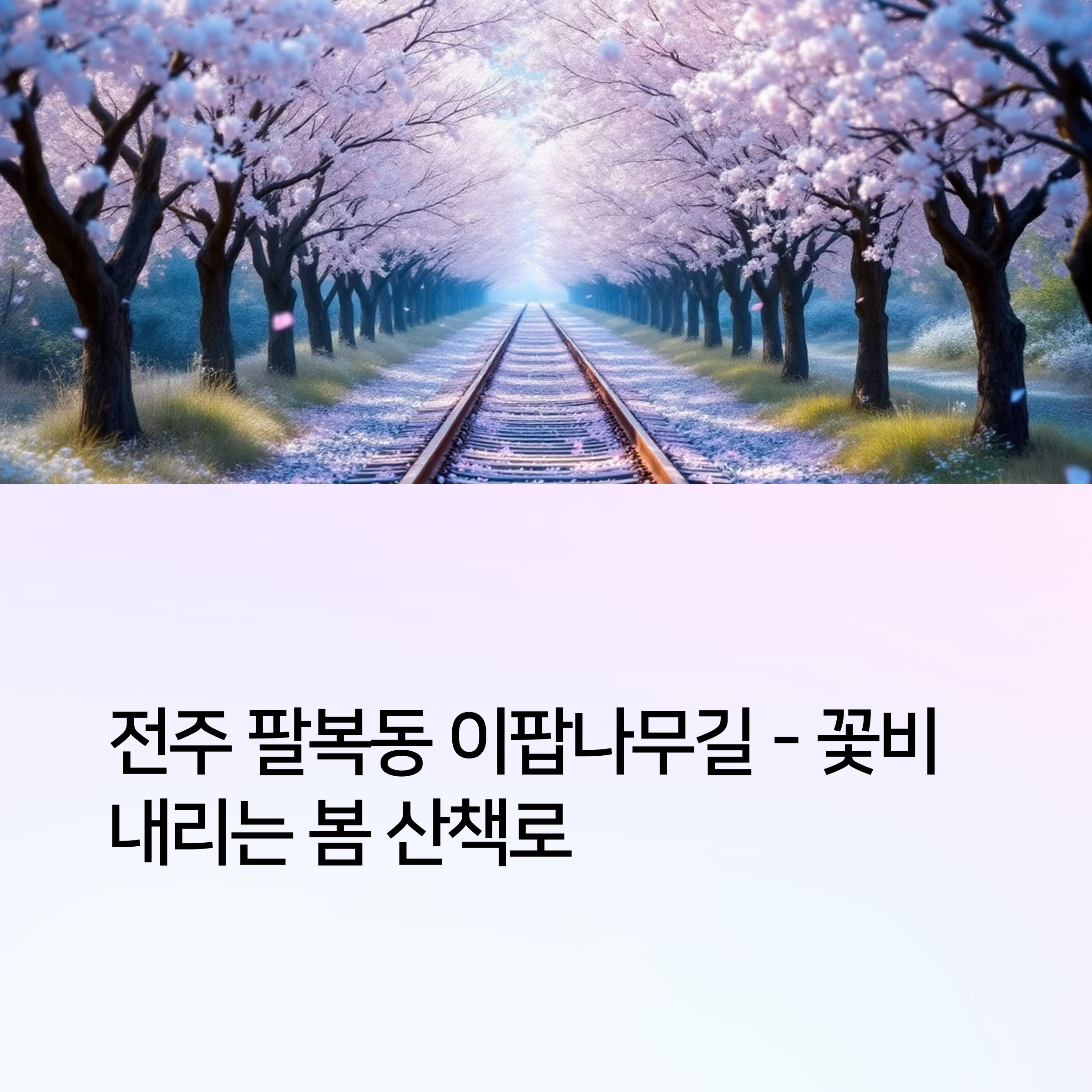 전주 팔복동 이팝나무 철길은 봄의 정취와 자연의 아름다움을 온몸으로 느낄 수 있는 대한민국의 대표 봄꽃 명소입니다. 하얀 꽃비가 내리는 듯한 풍경 속을 실제 기차가 지나가는 철길 위에서 산책할 수 있는 특별한 경험은 전국 어디에서도 쉽게 만나볼 수 없는 매력입니다. 문화예술, 야간조명, 지역경제 활성화를 함께 담은 이번 봄 시즌, 전주를 방문하신다면 꼭 들러보시길 추천드립니다.