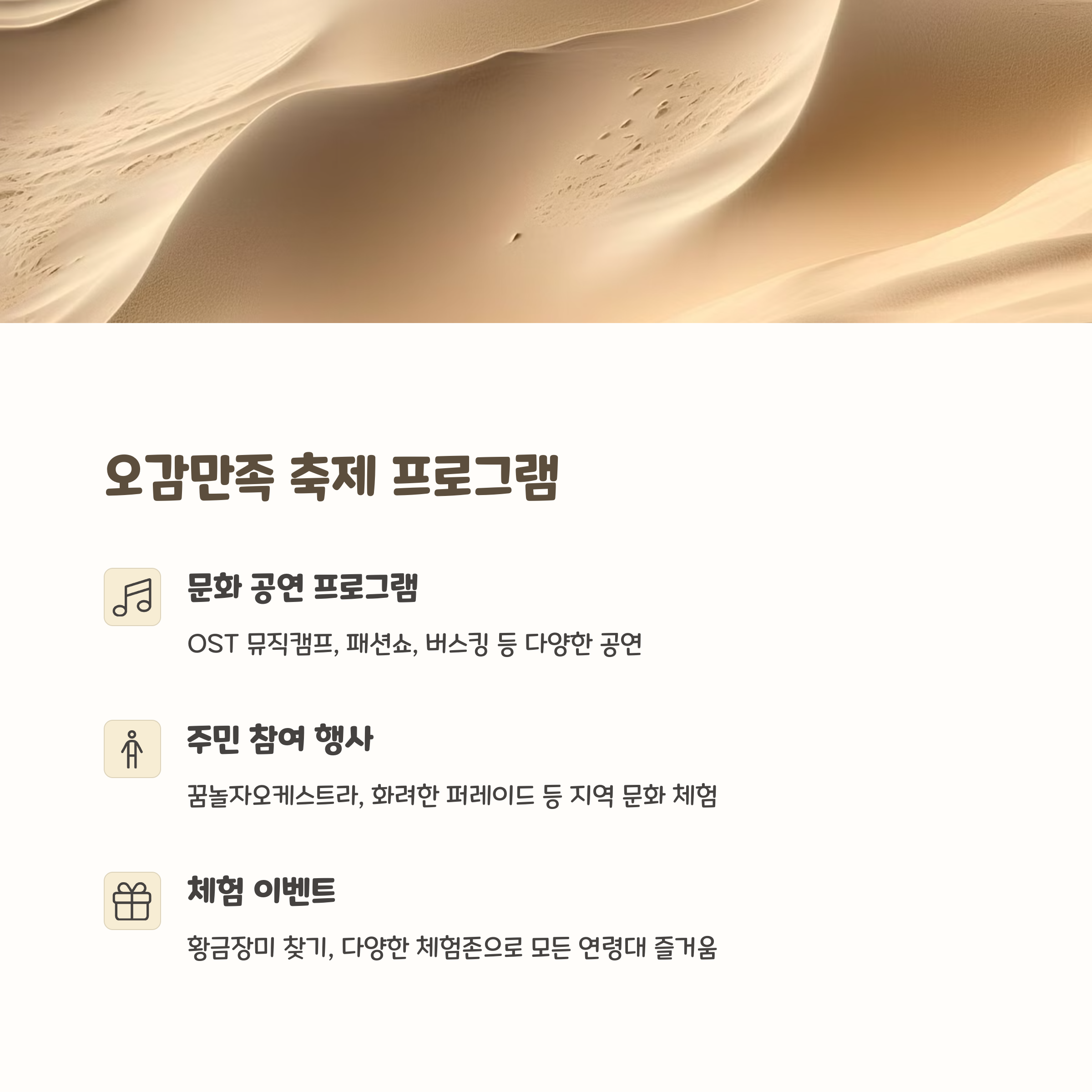 축제 기간 동안 낮에는 다양한 테마존과 포토존에서 인생샷을 남기고, 밤에는 조명과 장미향이 어우러진 환상적인 야간 산책이 가능합니다. ‘핑크 러브 터널’, ‘화이트 클래식 라운지’ 등 테마 공간은 마치 유럽 정원에 온 듯한 낭만적인 분위기를 자아내며, 조명이 켜지는 순간은 축제의 하이라이트로 꼽힐 만큼 특별한 감동을 선사합니다.
