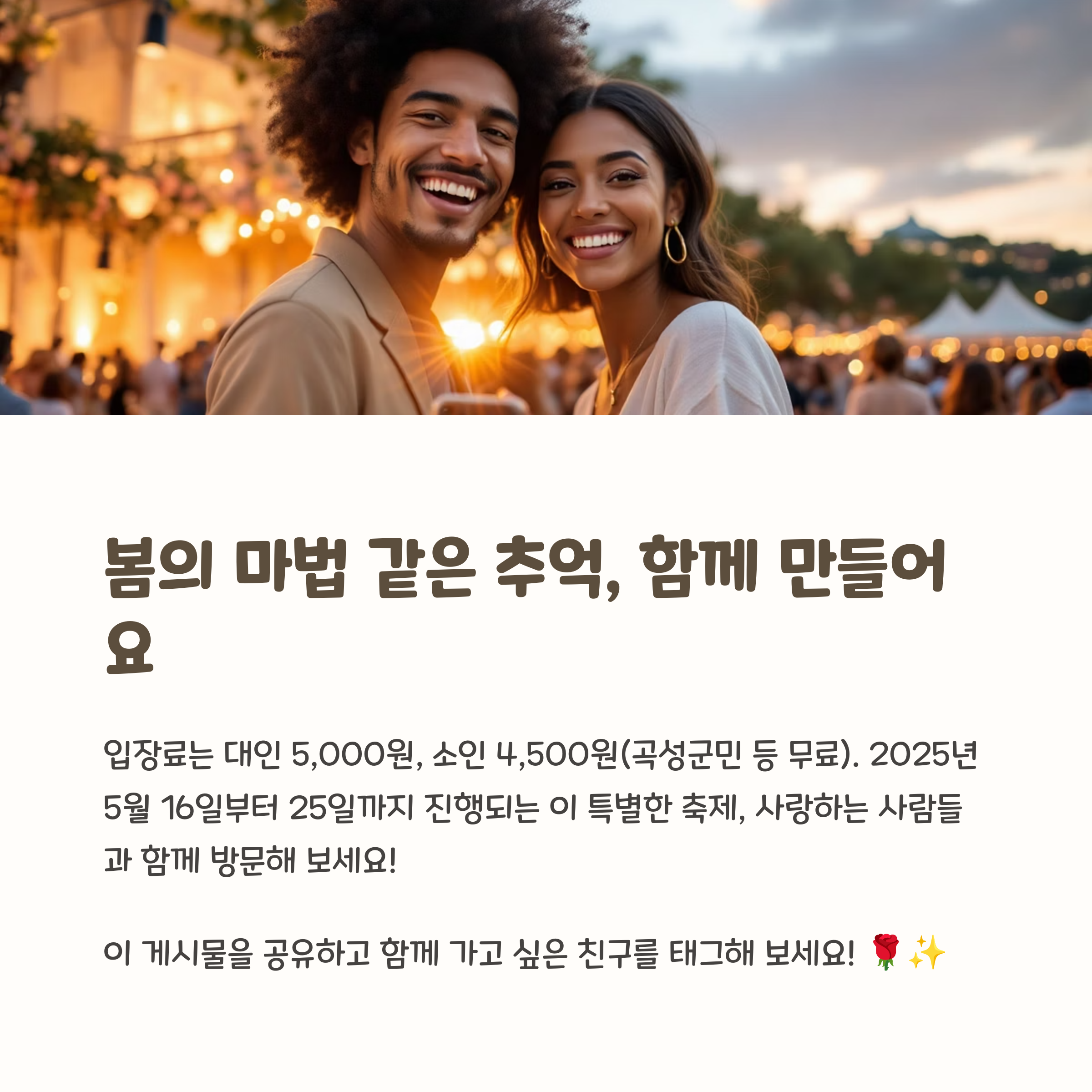 곡성세계장미축제에 다녀오신 경험이 있으신가요? 또는 이번에 방문할 계획이 있으신가요? 가장 기대되는 프로그램이나 궁금한 점을 댓글로 남겨주세요. 서로의 이야기를 나누며 더 풍성한 정보를 함께 만들어가요!