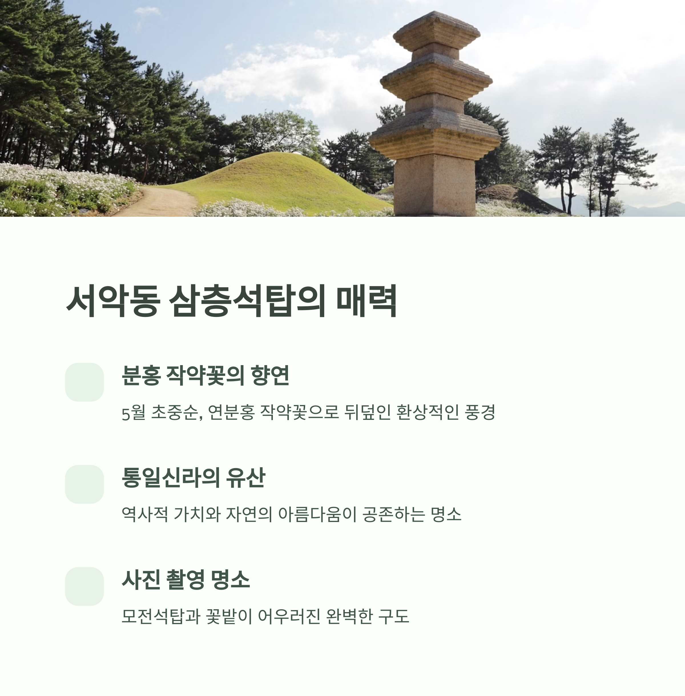 경주 서악동 삼층석탑은 역사와 자연을 한 번에 느낄 수 있는 소중한 여행지입니다. 분홍빛 작약꽃과 고즈넉한 석탑, 그리고 신라의 위엄을 간직한 왕릉과 고분군까지 모두 경험할 수 있어 봄철 최고의 여행지로 추천합니다. 하루 코스로 알차게 둘러볼 수 있어 짧은 여행에도 안성맞춤입니다. 아름다운 5월, 경주에서 특별한 추억을 만들어보세요.