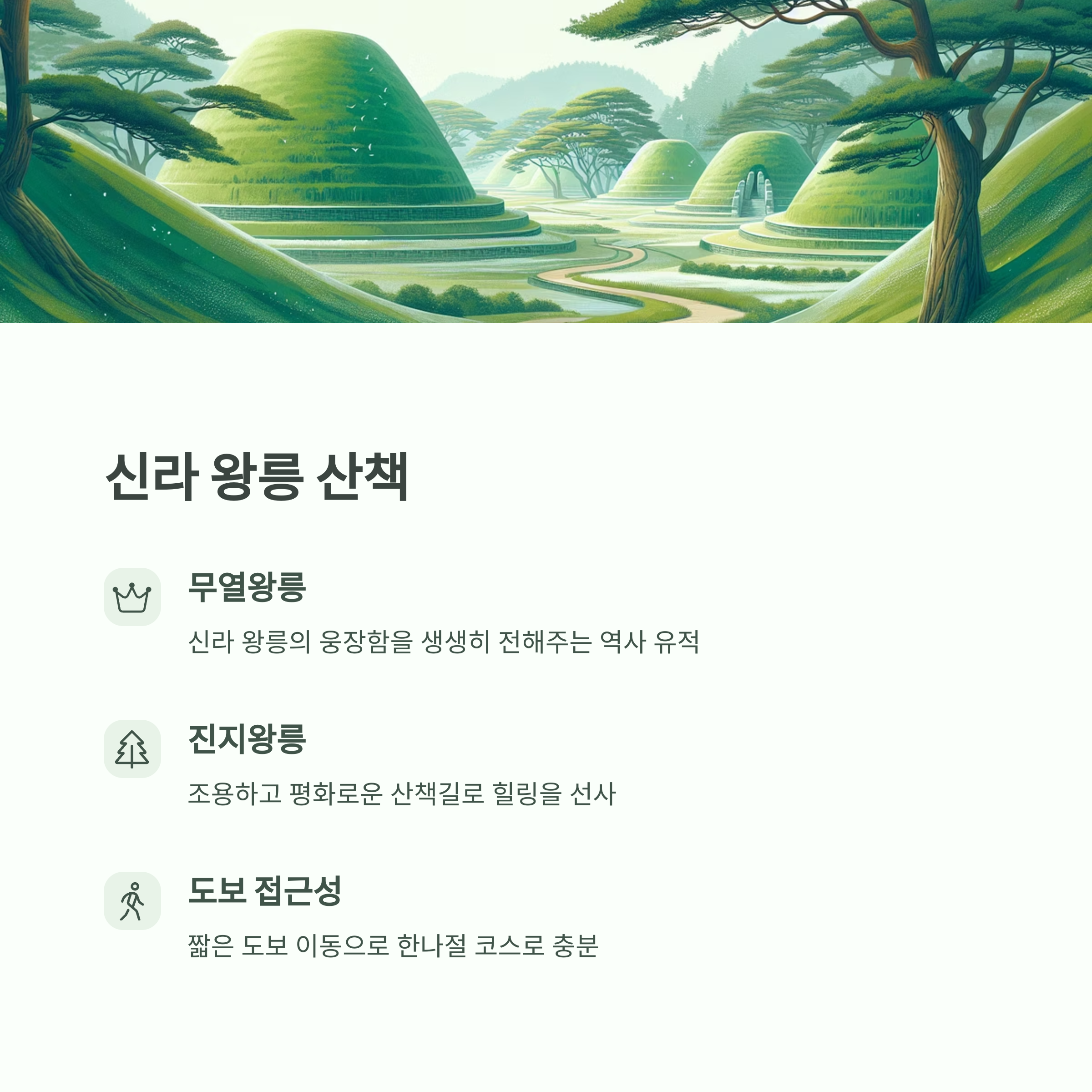 삼층석탑 인근의 무열왕릉과 진지왕릉은 신라 왕릉의 웅장함을 생생히 전해줍니다. 짧은 도보 이동으로 쉽게 접근할 수 있어 한나절 코스로도 충분히 다녀올 수 있습니다. 조용하고 평화로운 산책길은 여행자들에게 힐링을 선사합니다. 역사적 의미를 지닌 무덤들을 둘러보며 신라시대의 흔적을 가까이에서 느껴보세요.