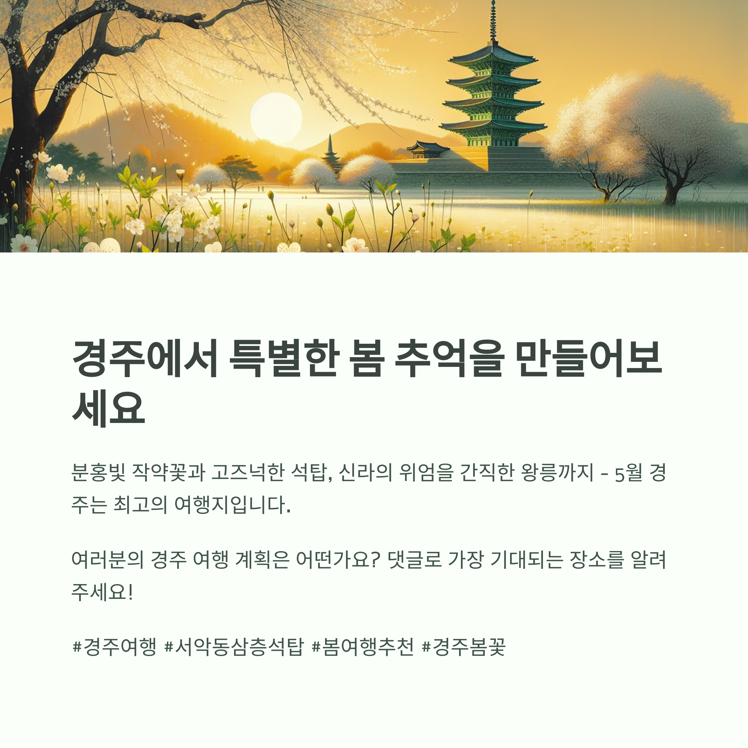 이번 경주 여행코스 중 가장 기대되는 장소는 어디인가요? 댓글로 여러분의 여행 계획을 공유해 주세요! 다양한 의견을 통해 더 풍성한 여행 정보를 함께 나눌 수 있답니다.