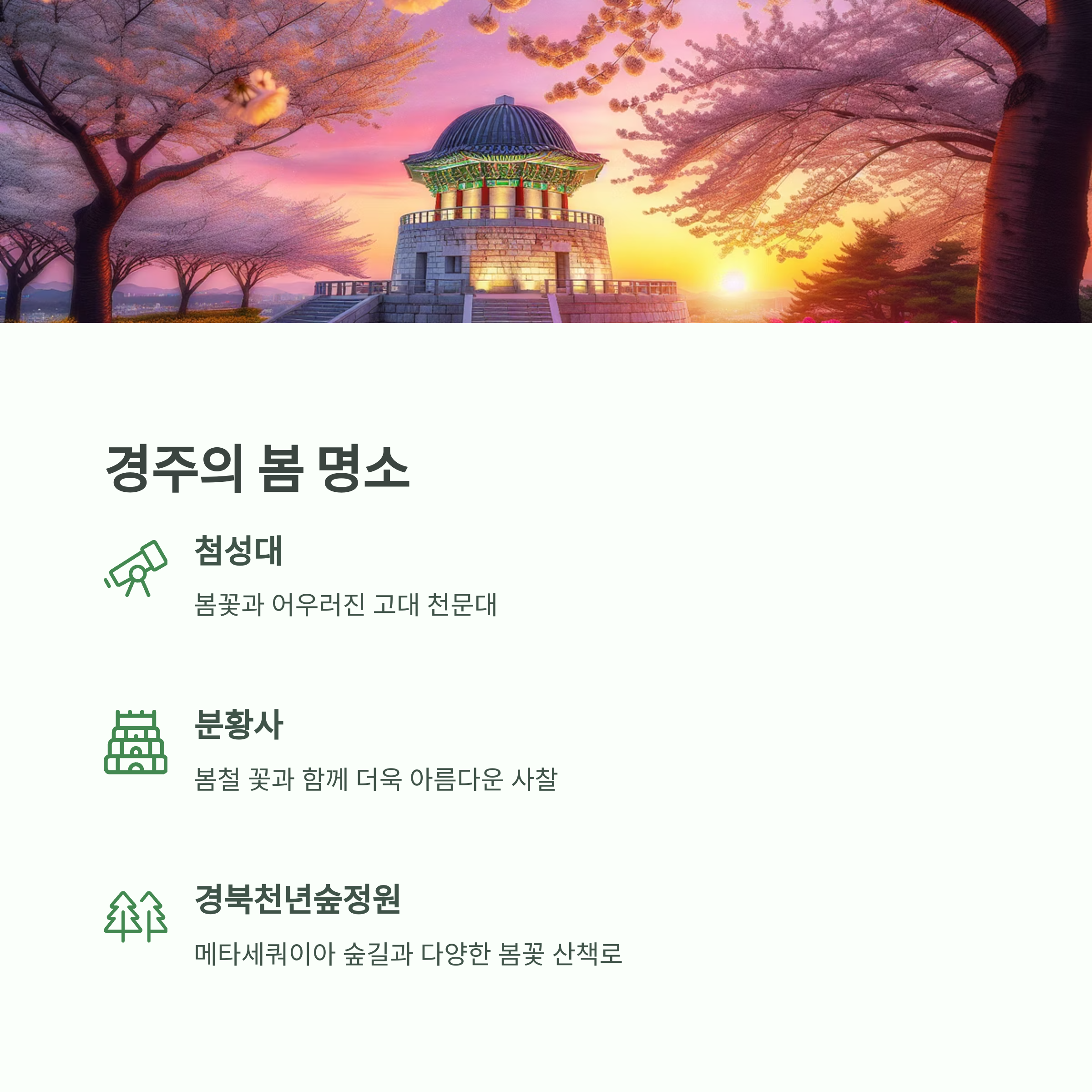 첨성대와 대릉원, 그리고 분황사 등 경주의 주요 문화재도 봄철 꽃과 어우러져 더욱 아름다운 모습을 보여줍니다. 경북천년숲정원에서는 산책로를 따라 다양한 봄꽃과 메타세쿼이아 숲길을 경험할 수 있어 봄 나들이로 손색이 없습니다. 경주 시내와 황리단길도 가깝기 때문에 카페 투어나 지역 맛집 탐방까지 하루 동안 알차게 즐길 수 있습니다.