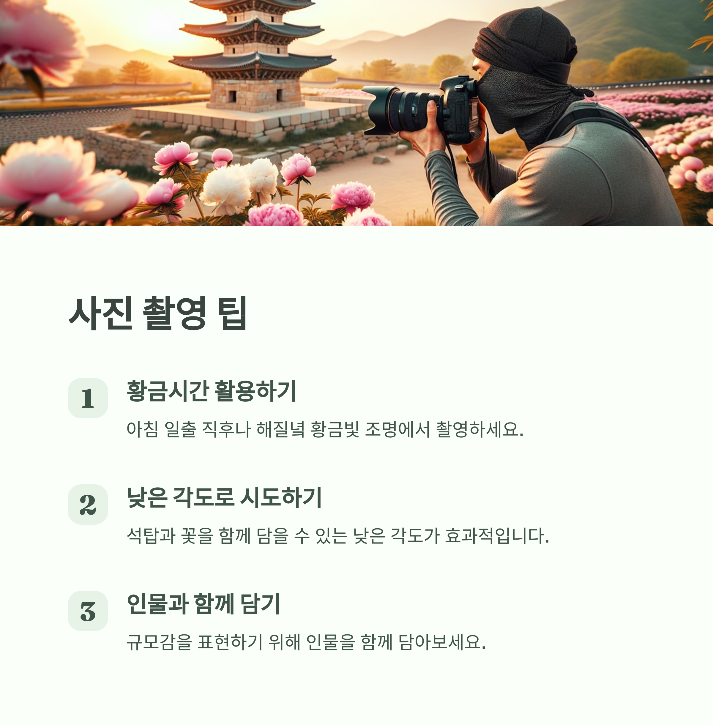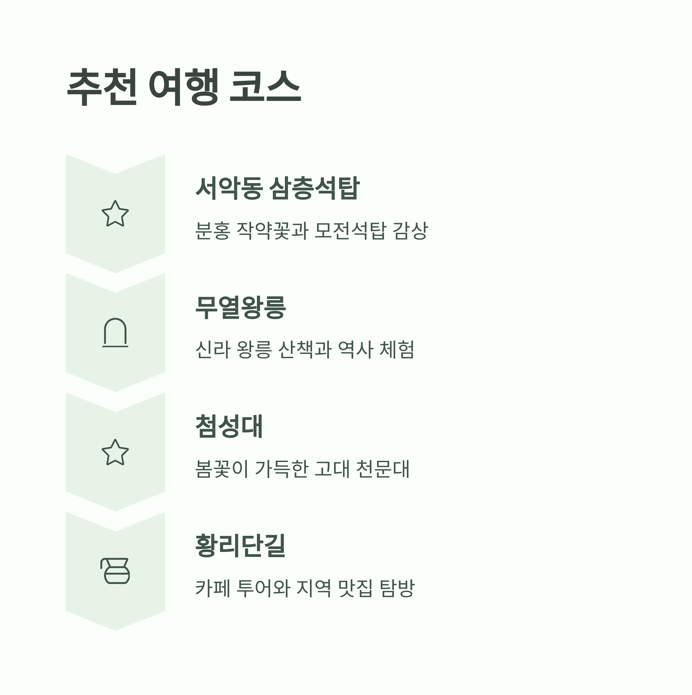 | 분홍 작약꽃과 모전석탑 감상 | 신라 왕릉 산책과 역사 체험 | 봄꽃이 가득한 고대 천문대 |