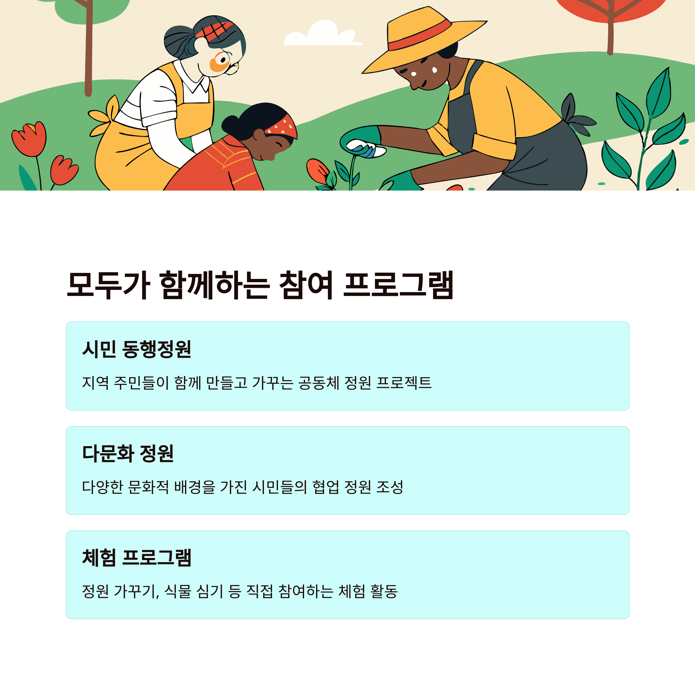 특히 눈에 띄는 점은 학생과 시민이 직접 참여하는 정원 조성입니다. 고등학생과 대학(원)생을 대상으로 한 ‘학생동행정원’과, 일반 시민이 참여하는 ‘시민동행정원’이 운영되어 실제로 정원을 설계하고 조성하는 소중한 경험을 제공합니다. 참가자들은 전문가의 멘토링도 함께 받을 수 있어, 정원문화에 대한 이해와 애정을 깊이 있게 키울 수 있습니다.