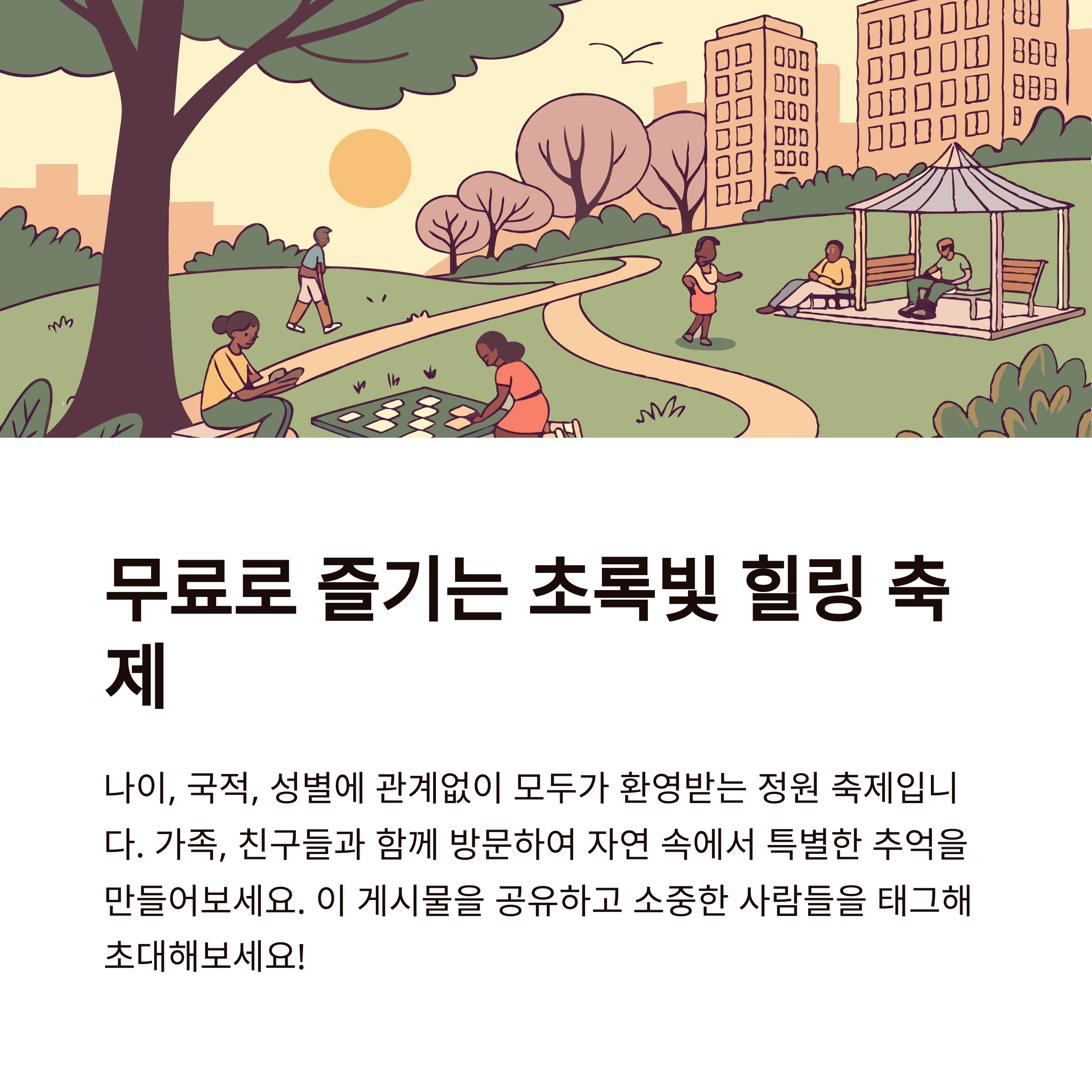 5월부터 가을까지 이어지는 서울국제정원박람회는 바쁜 일상에 지친 현대인에게 자연과 함께 숨 쉴 수 있는 소중한 기회를 제공합니다. 초록의 물결로 가득 찬 보라매공원에서 다양한 정원과 프로그램을 체험하며 특별한 하루를 만들어 보세요. 무료 입장이 가능한 만큼 친구, 가족, 연인과 함께 가벼운 마음으로 방문해보시길 추천드립니다.