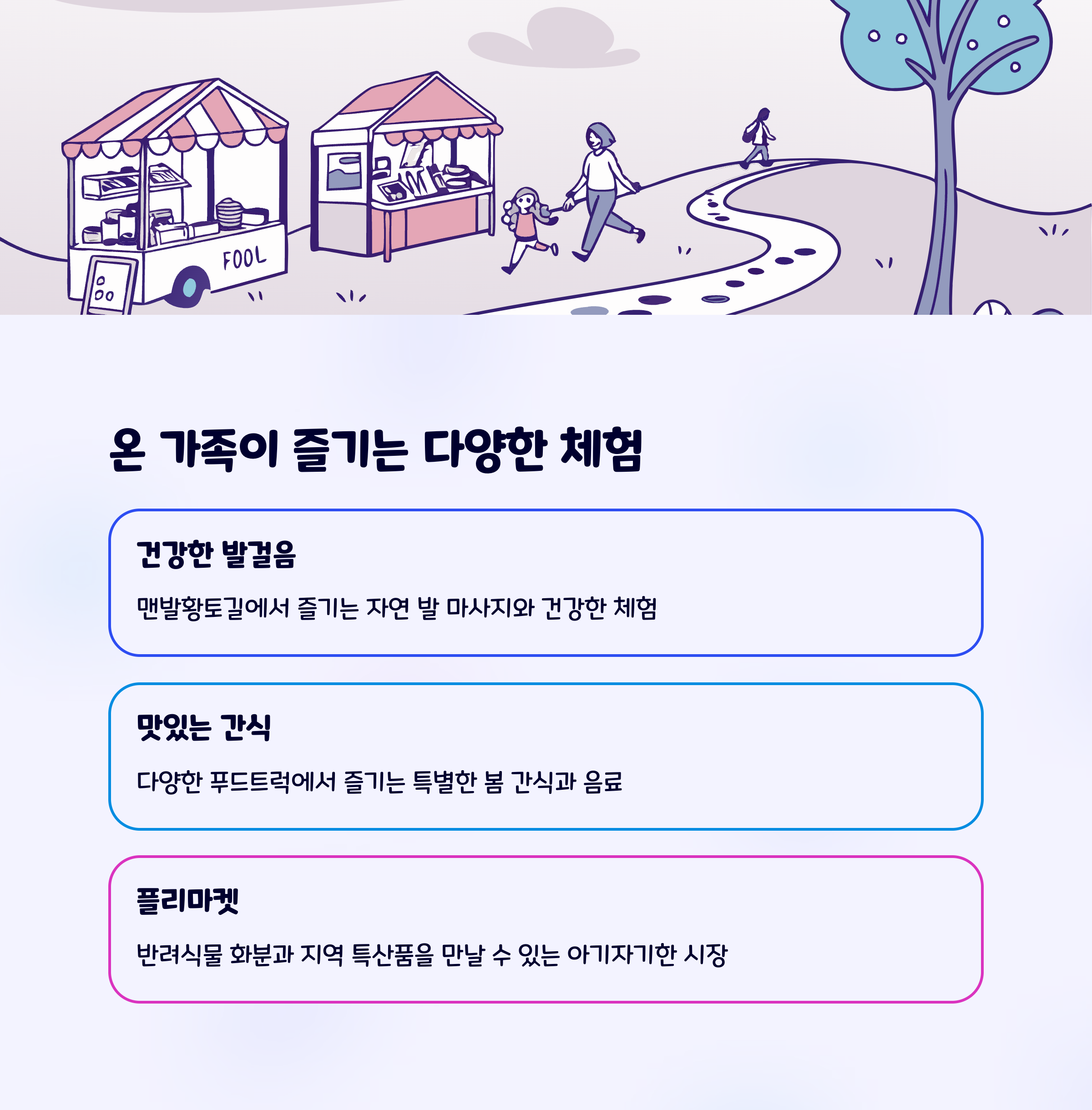 | 핫들생태공원 작약꽃밭 | 플리마켓, 체험 부스 | 주차장, 푸드트럭, 쉼터 |