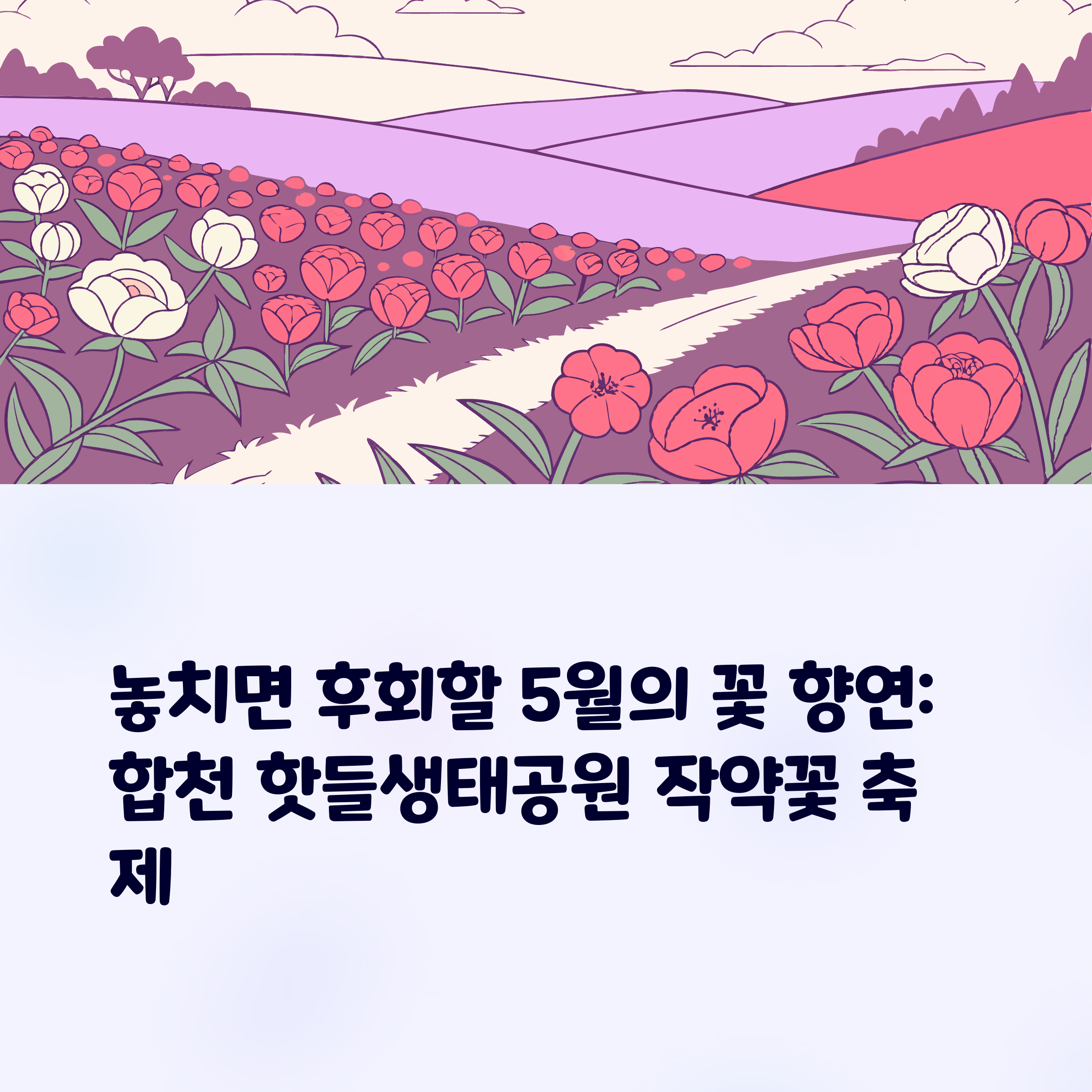 안녕하세요, 블로그 이웃 여러분. 오늘은 5월, 전국 각지에서 수많은 관광객들이 찾아오는 합천 핫들생태공원을 소개합니다. 황강과 합천천이 만나는 지점에 위치한 이곳은 약 6,000평에 달하는 넓은 꽃밭을 수놓은 다양한 색상의 작약꽃으로 유명한 명소입니다. 작약꽃은 '수줍음'이라는 꽃말처럼 단아하면서도 화려한 아름다움을 간직하고 있어 매년 5월 초부터 중순까지 약 2주간 핫들생태공원을 환상적인 풍경으로 물들입니다. 오늘 포스팅에서는 작약꽃밭 규모, 편의시설, 체험 프로그램, 방문 팁까지 꼼꼼히 소개해드릴 예정이니 끝까지 함께해주세요!