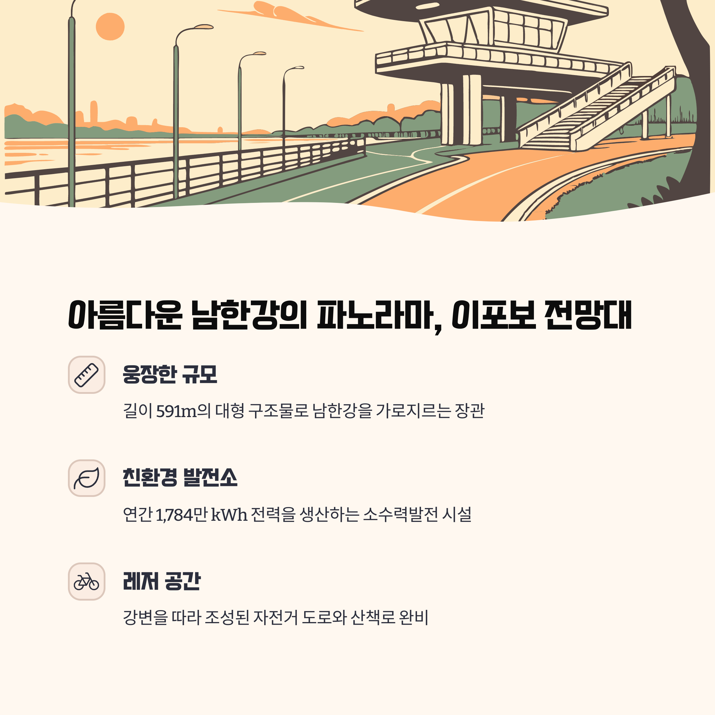 이포보 전망대는 남한강의 수문 구조물을 중심으로 설계된 친환경 명소로, 백로를 형상화한 디자인이 인상적입니다. 수문 6개와 공도교, 자전거길, 전망대가 어우러져 다양한 이용자층에게 맞는 휴식과 여가 활동이 가능하며, 소수력발전으로 연간 1,784만 kWh 전력을 생산하는 기능까지 갖췄습니다. 전망대에서는 강과 어도가 어우러진 풍경을 한눈에 볼 수 있어 사진 명소로도 유명합니다.