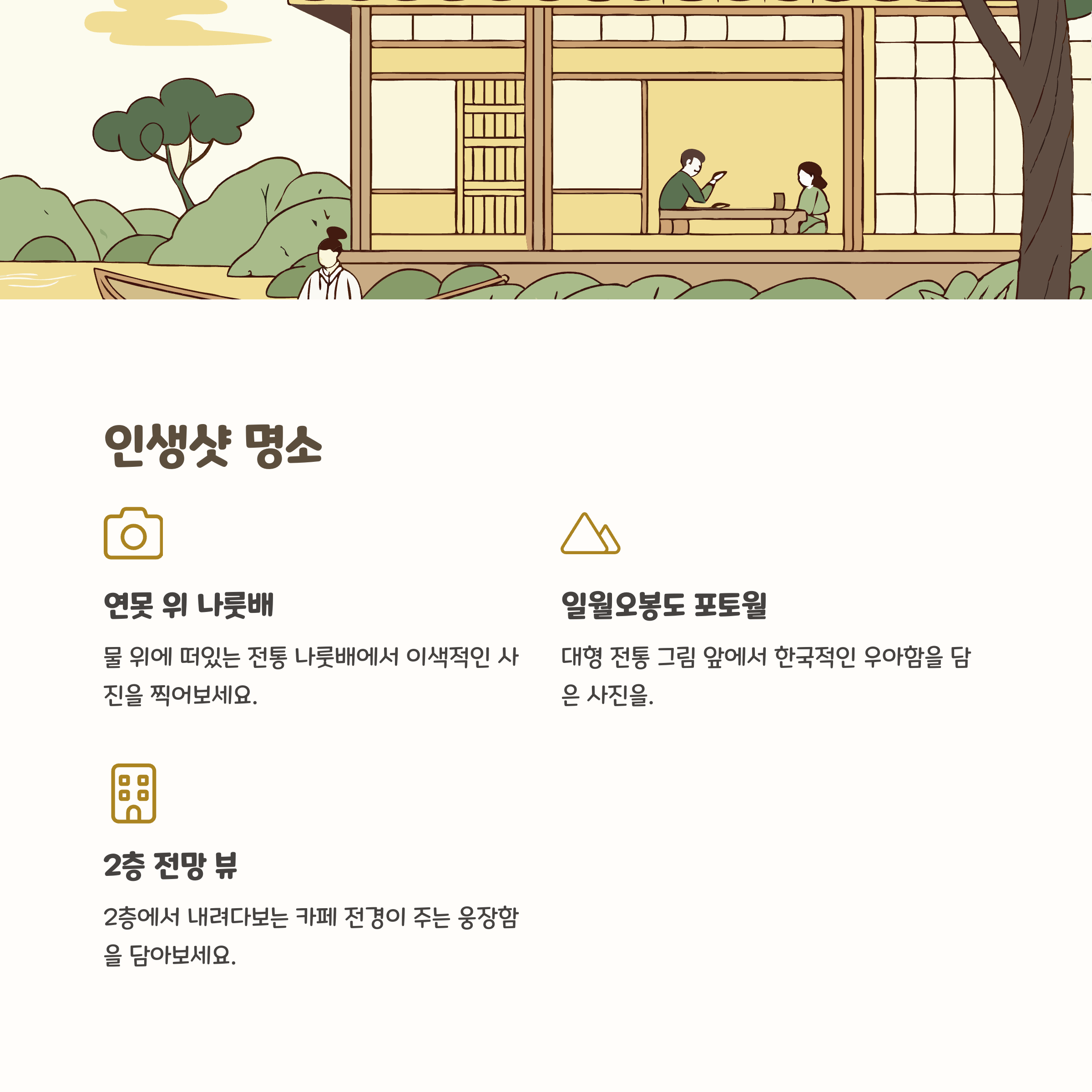 | 대표 요소 | 일월오봉도·수묵화·정자·연못·전통 디저트·대형 포토존 |