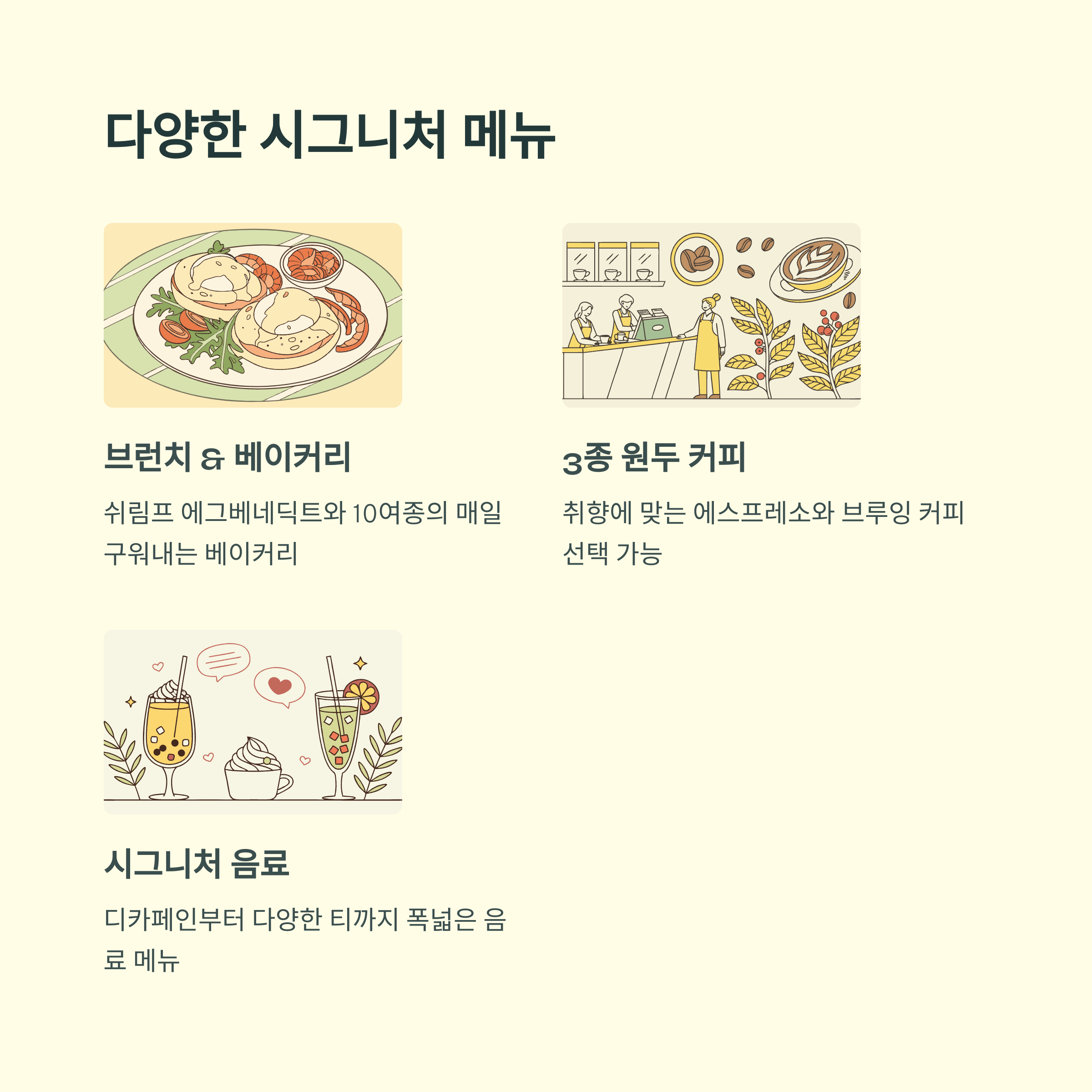 | 인스타그램 인증샷 명소, SNS 인기 포인트 | 산미, 중후함, 묵직함 등 취향 맞춤 선택 | 라운드 식물존, 비스트로, 루프탑 등 감성 충만 |