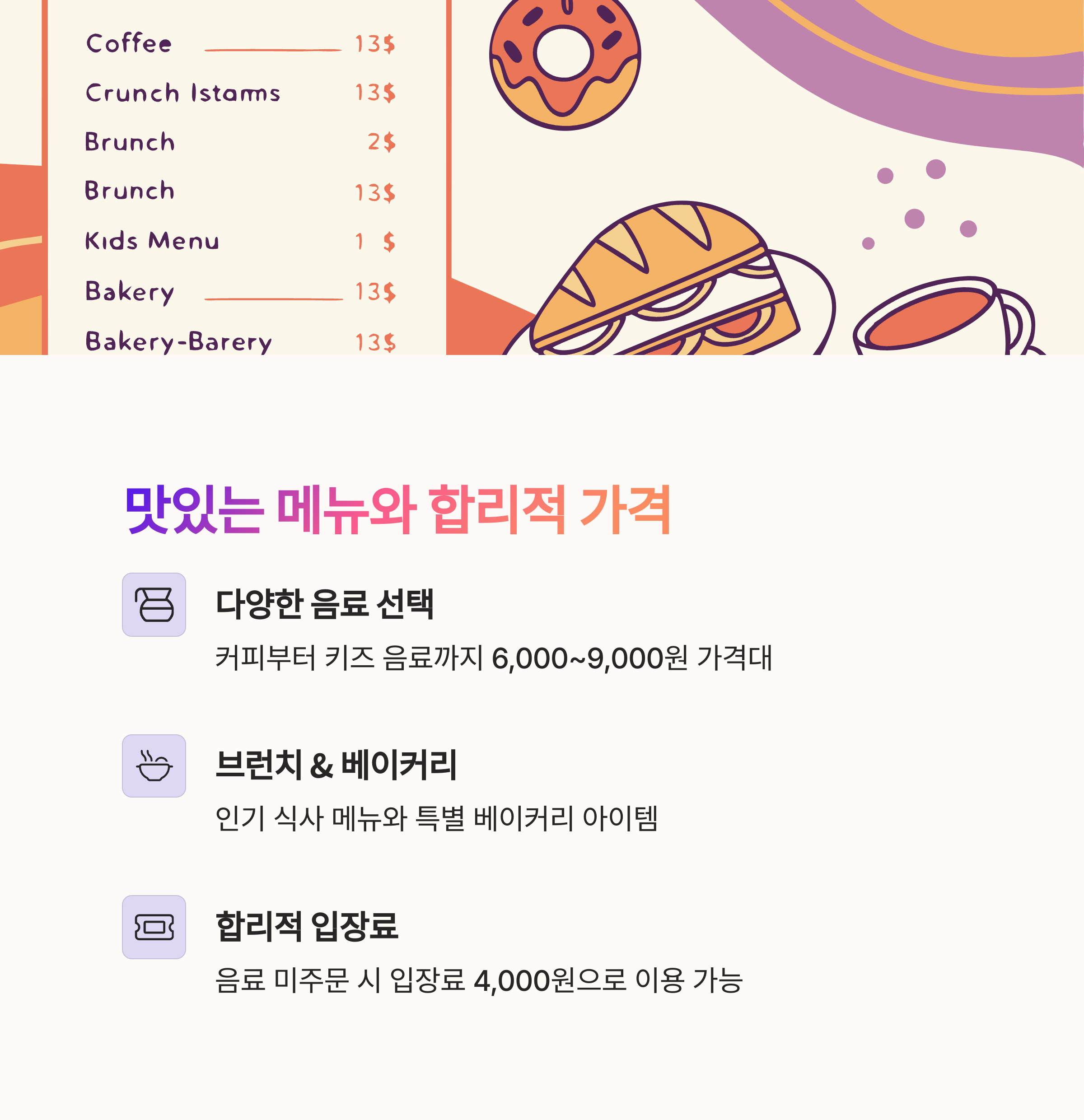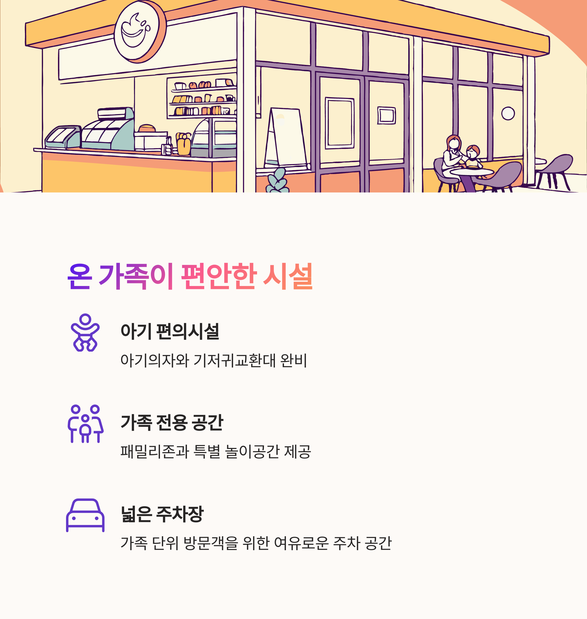 주차공간은 넉넉하고 전 구역 무료로 제공되며, 아기의자, 기저귀 교환대 등 유아 동반을 위한 편의시설도 잘 갖춰져 있습니다. 베이커리는 빠르게 소진되므로 이른 방문이 좋고, 브런치와 수제버거 메뉴는 아이와 함께 즐기기에도 적당한 구성이며, 커피 외에도 다양한 키즈 음료가 준비되어 있어 가족 모두 만족할 수 있는 카페 환경이 조성되어 있습니다.