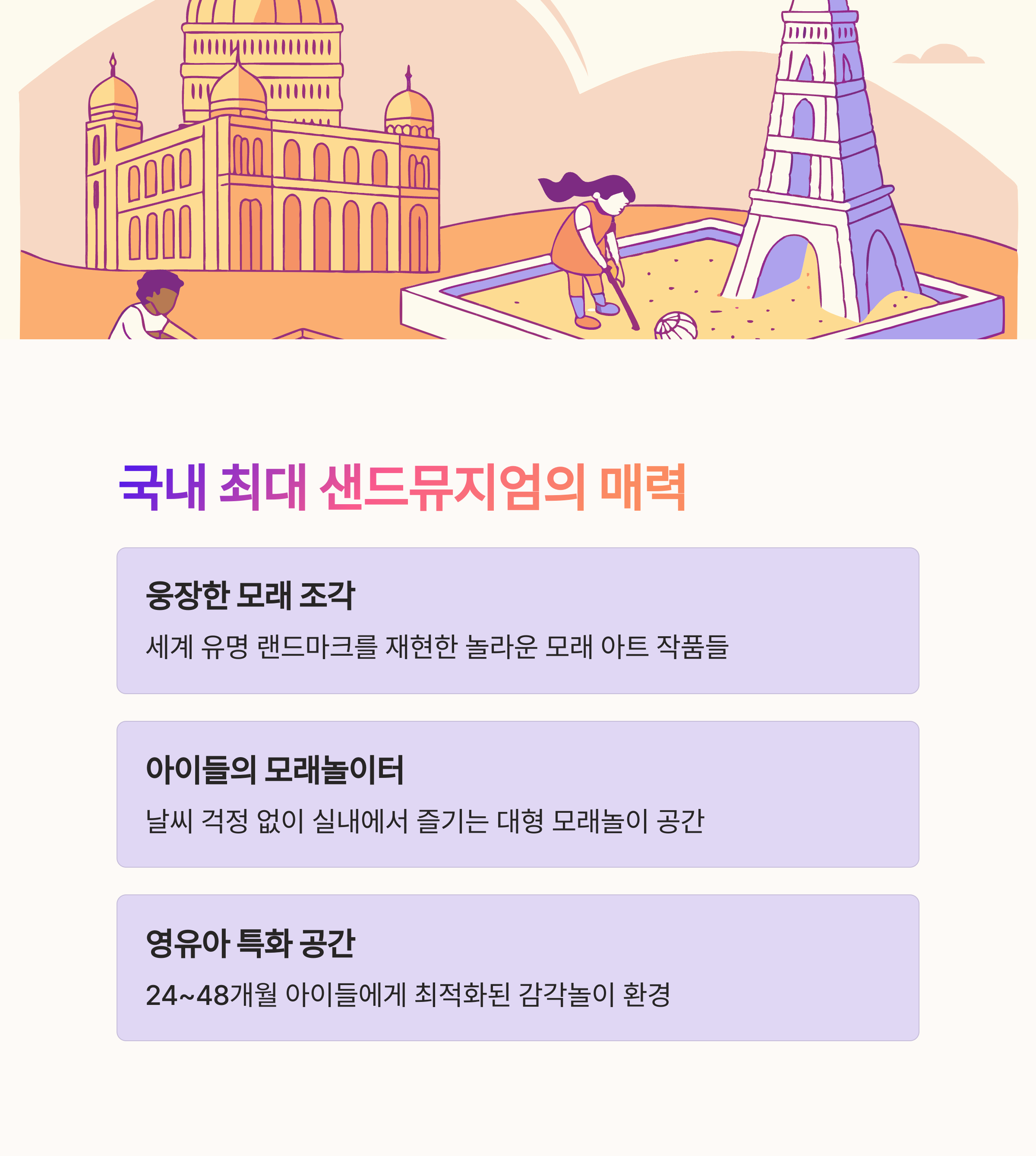 | 주요 포인트 | 샌드뮤지엄, 모래놀이터, 키즈메뉴, 넓은 주차장 |