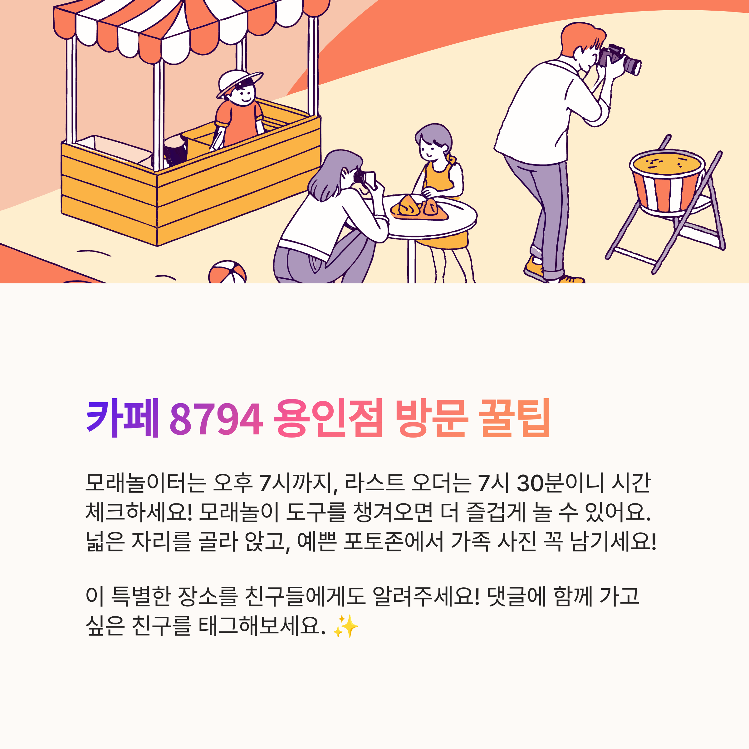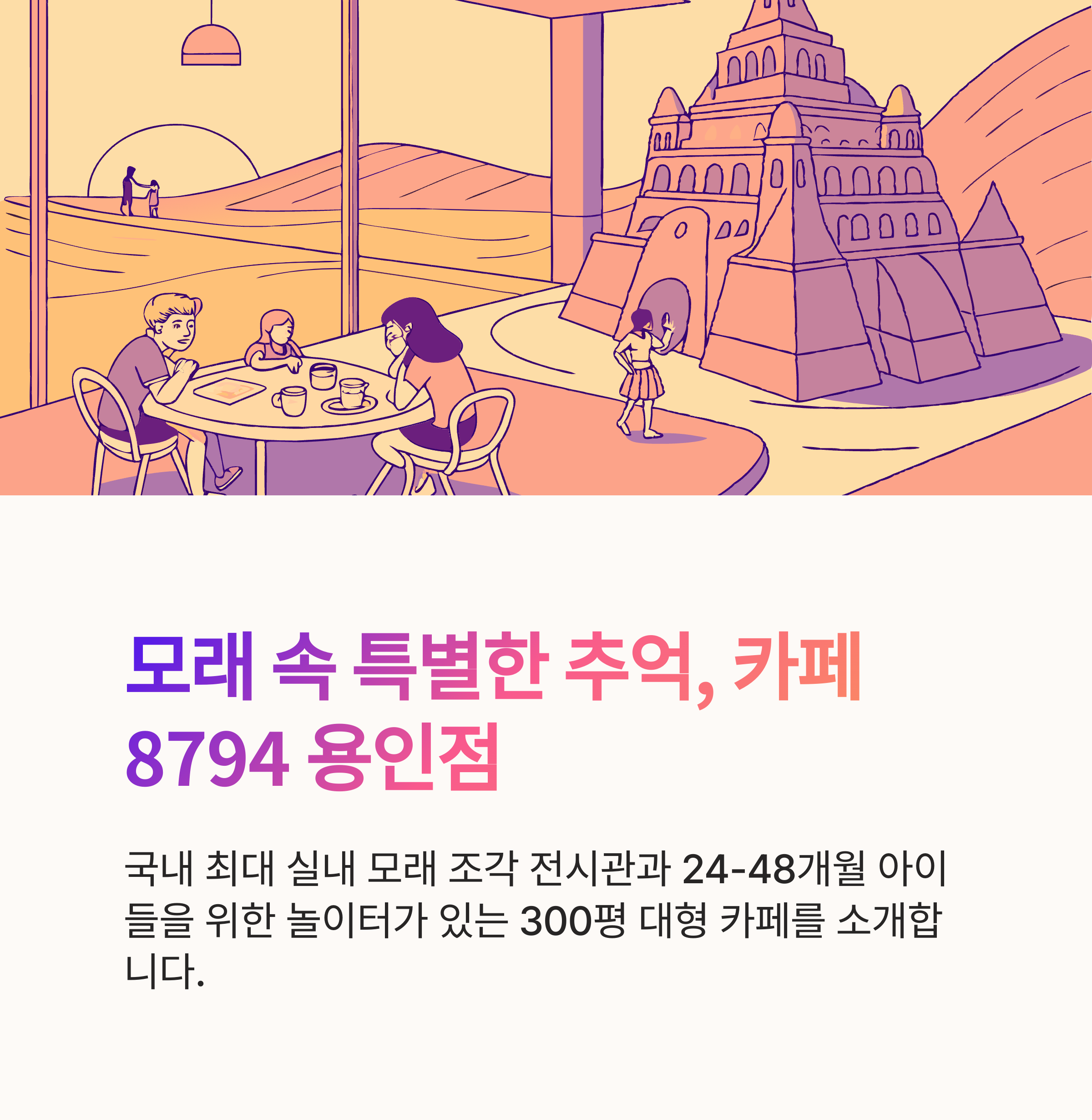카페 8794 용인점은 단순한 공간이 아닌, 아이들과 가족이 함께하는 특별한 시간을 위한 복합 문화 공간입니다. 실내 모래놀이터와 샌드뮤지엄, 키즈 전용 메뉴와 편의시설까지 완비되어 있어 어린 자녀를 둔 가정에게 특히 추천할 만한 장소입니다. 날씨와 관계없이 쾌적한 환경에서 안전하게 놀이와 브런치를 즐기고 싶다면 카페 8794는 최고의 선택이 될 것입니다. 실내 활동, 포토존, 문화체험까지 한 번에 가능한 이곳에서 소중한 가족의 하루를 더 특별하게 만들어보세요.