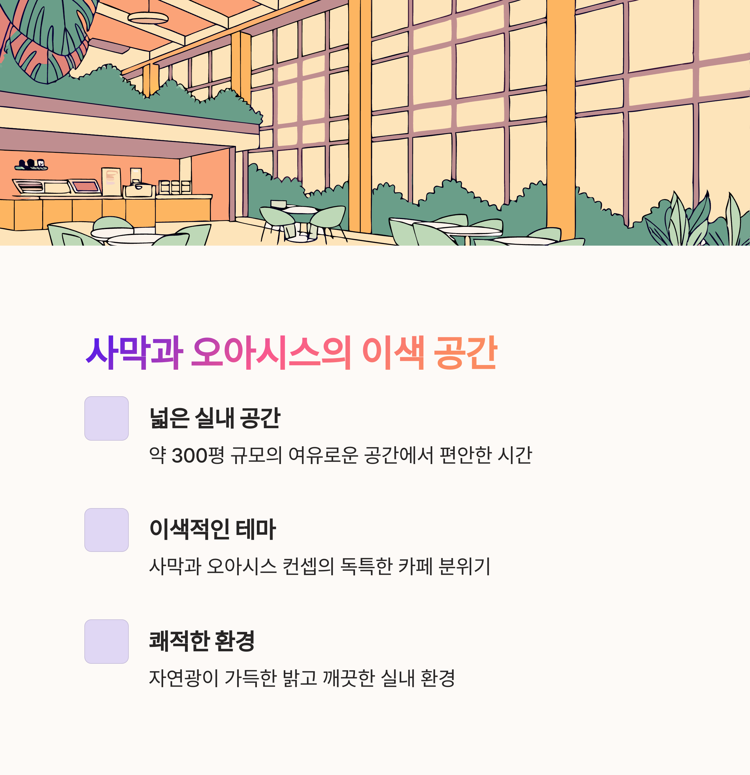 | 국내 최대 실내 모래 조각 전시관 운영 | 실내 모래놀이터, 키즈 메뉴, 기저귀 교환대 등 | 비 오는 날 방문 가능한 실내형 대형 카페 |