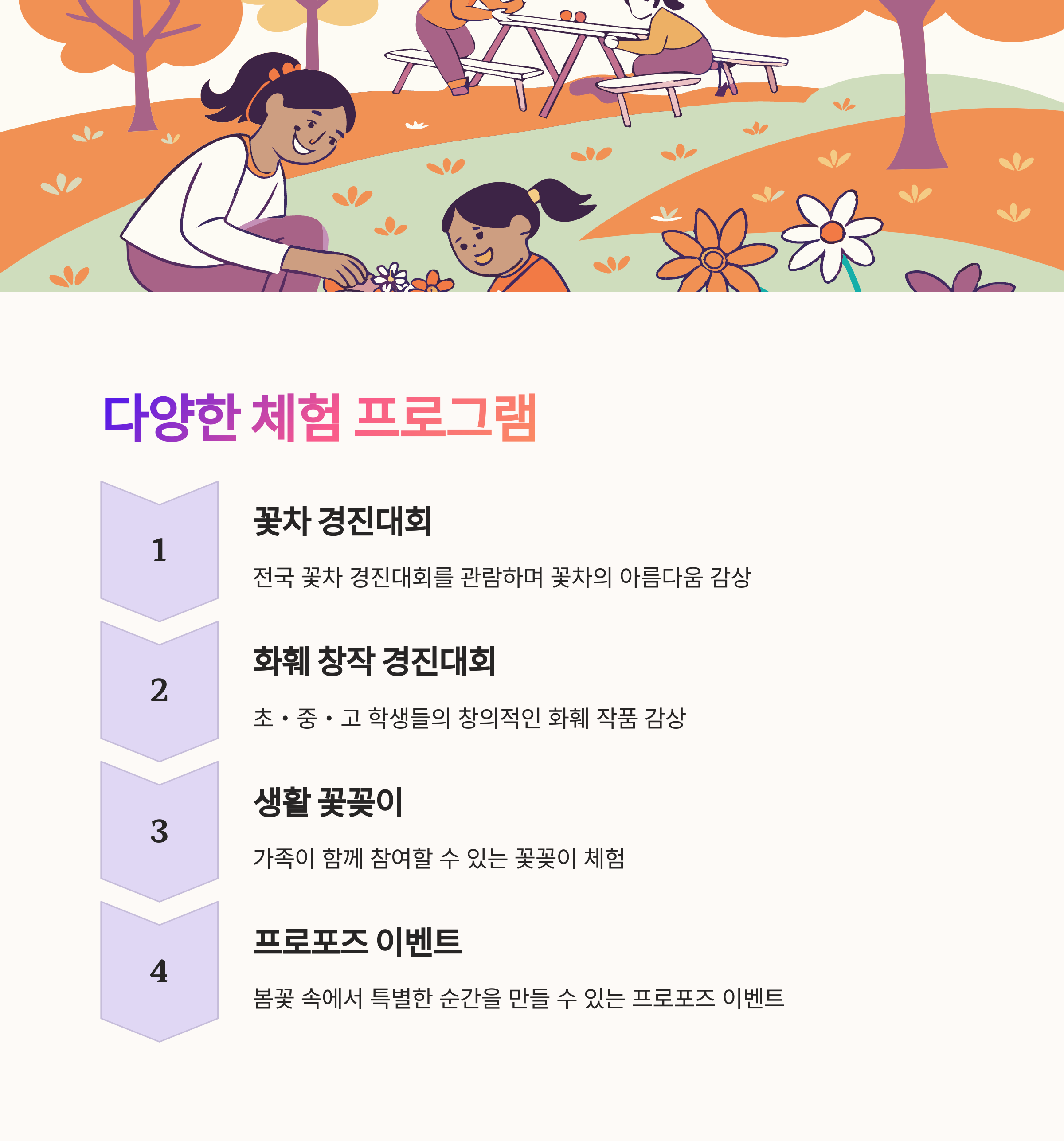 | 다양한 장소에서 무료 입장 가능, 실내·야외 선택 가능 | 주차요금 합리적, 잔디광장 제외 대부분 구역 사용 가능 | 개막식, 꽃 조형물, 프로포즈 꽃다발 만들기 체험 |