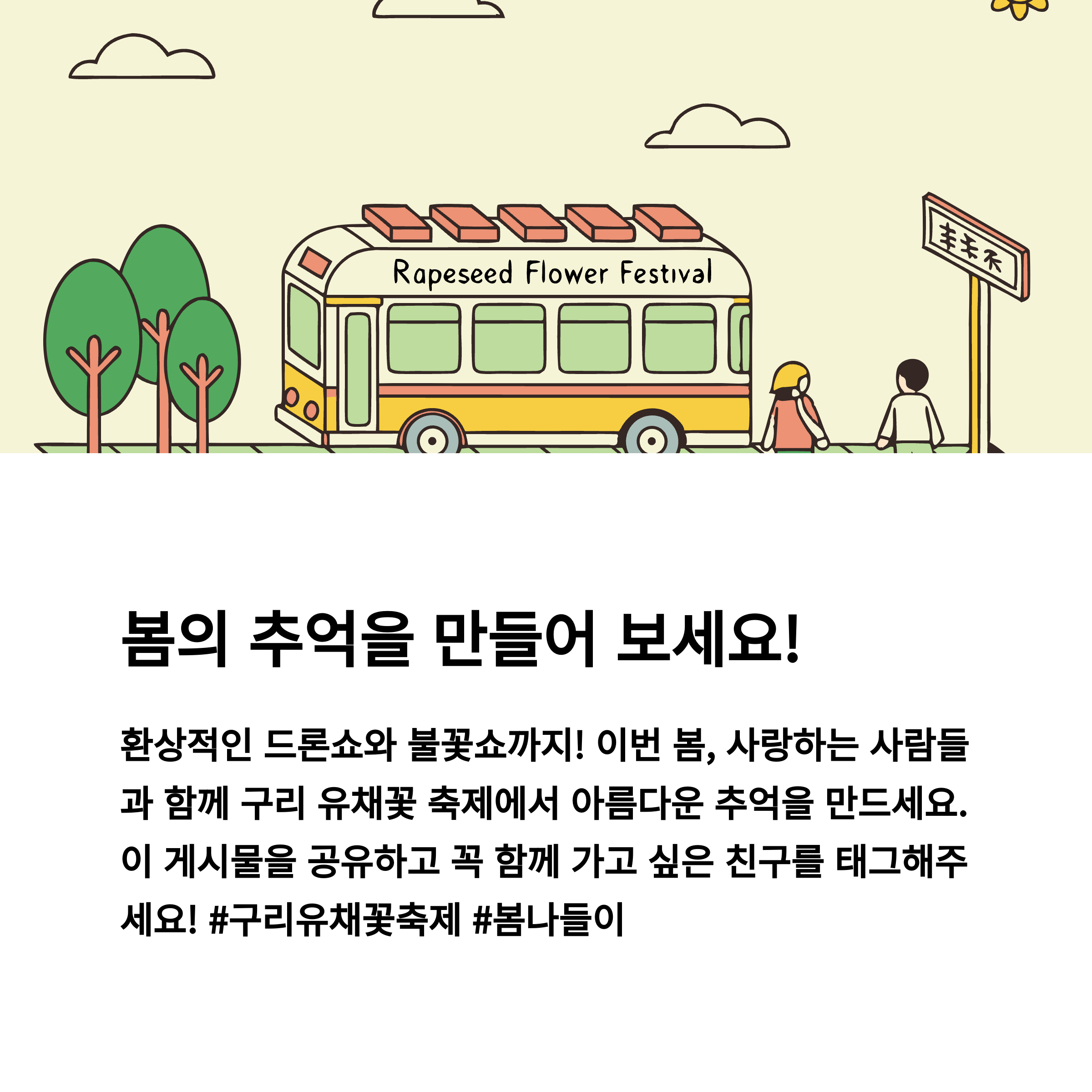 | 축제개요 | 2025 구리 유채꽃 축제의 일정, 장소, 주요 프로그램 정보를 간결하게 전달합니다. |