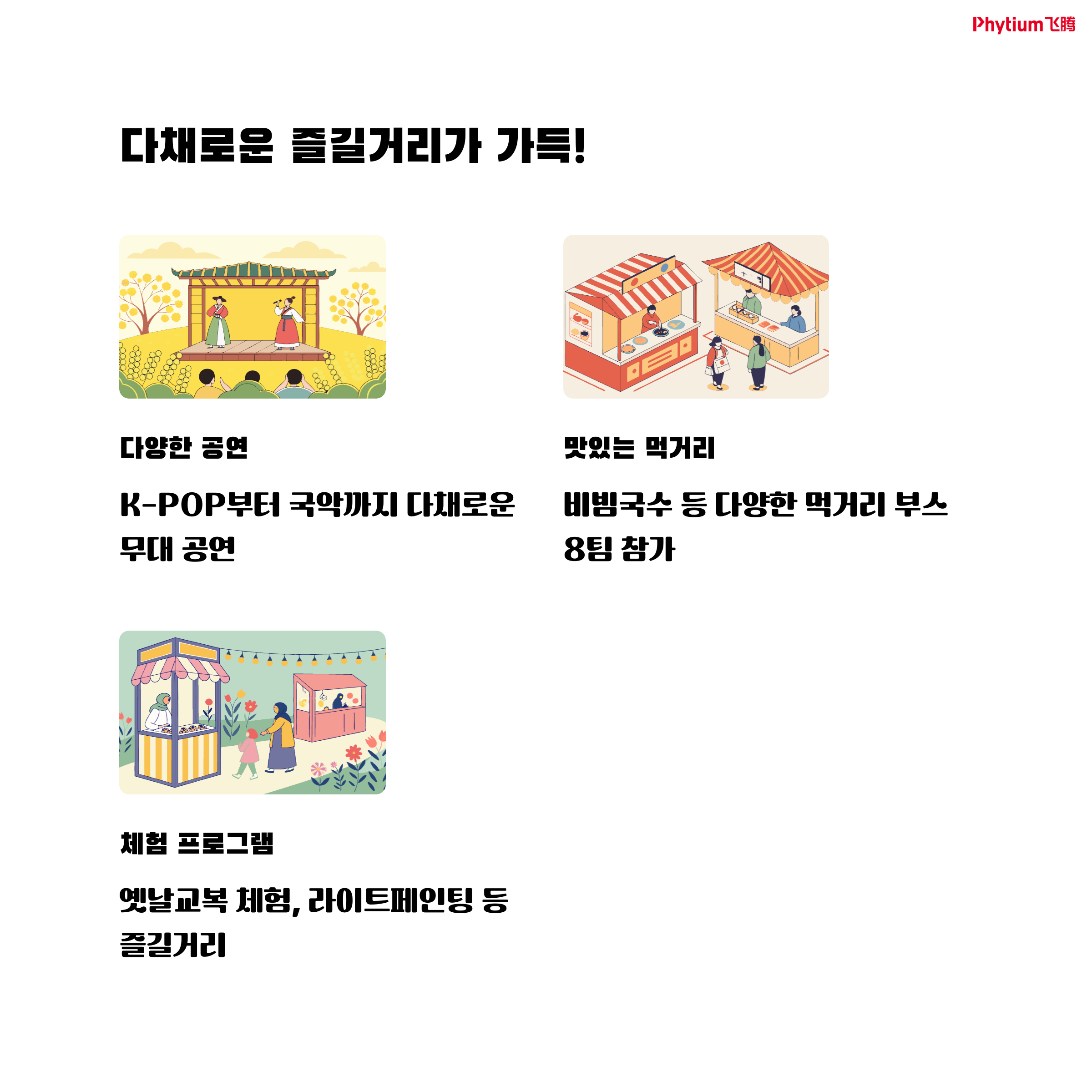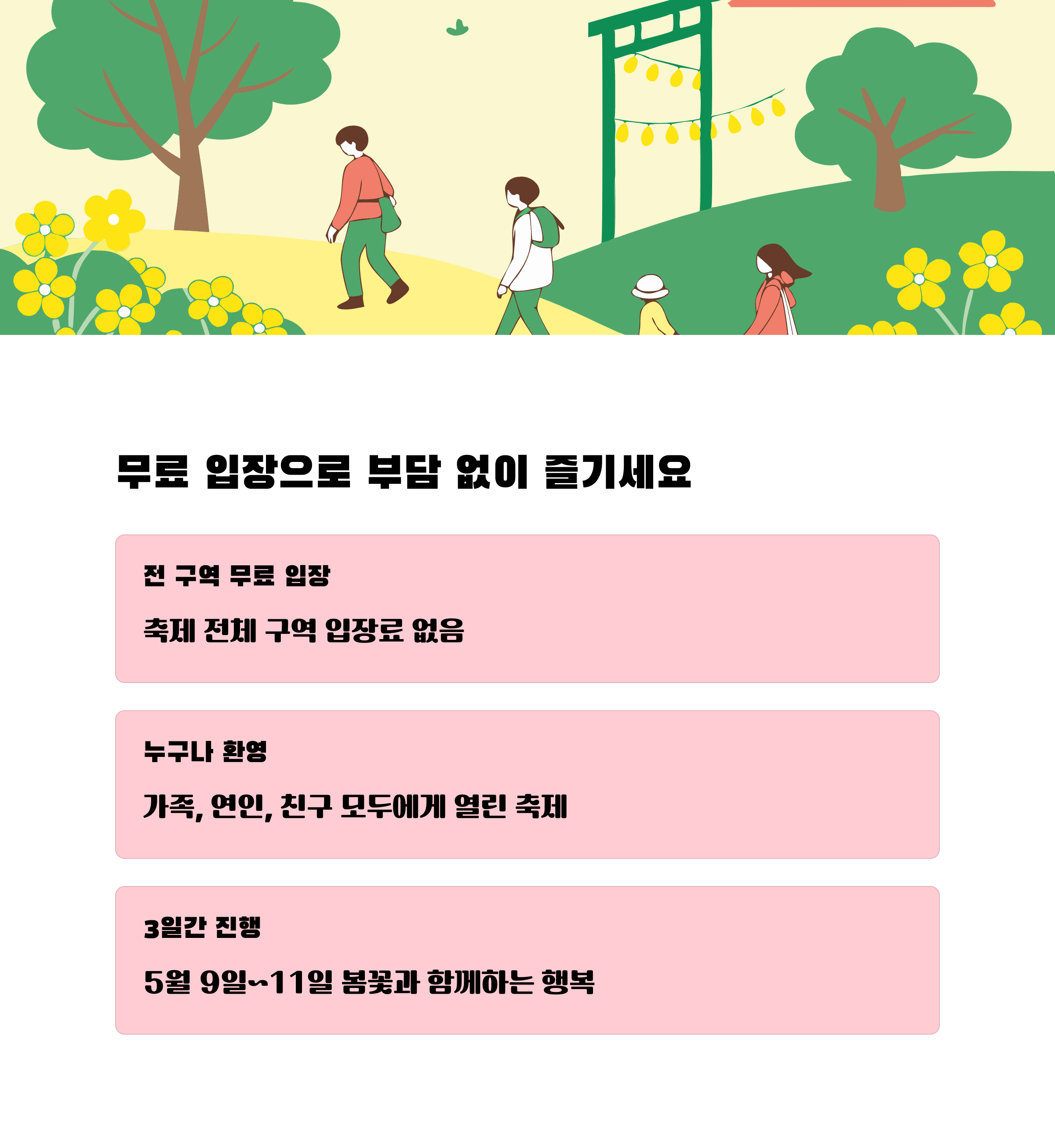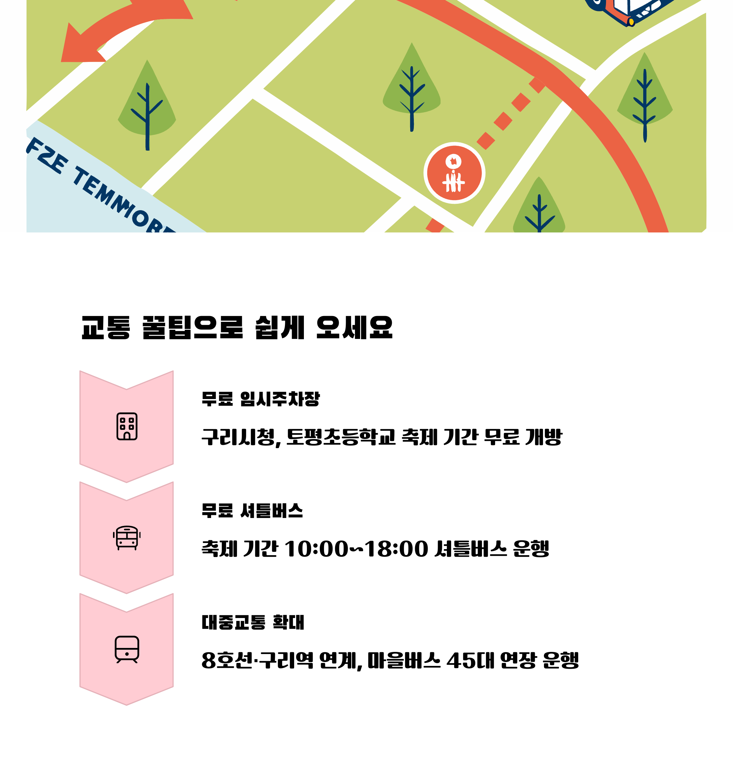 | 편의정보 | 축제 방문 시 주차, 교통, 편의시설 등 필요한 정보를 알기 쉽게 안내합니다. |