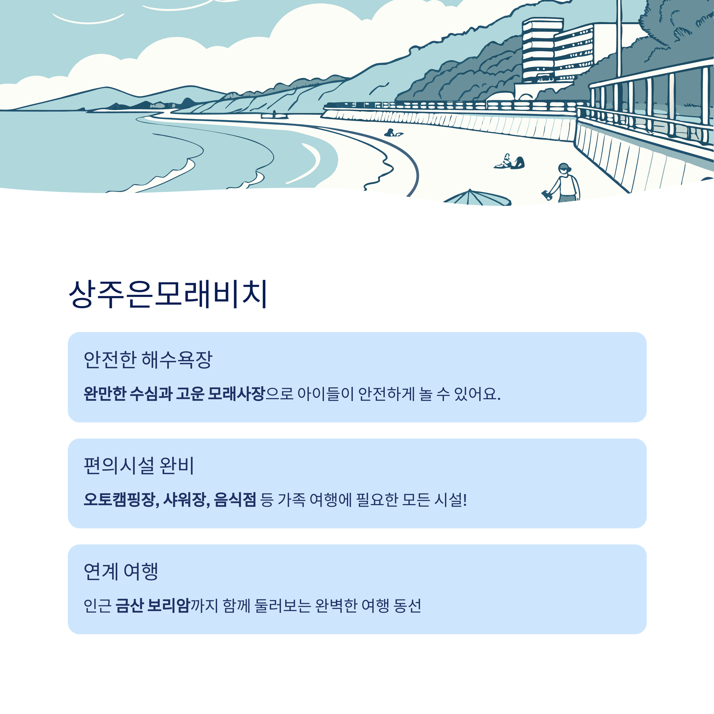 상주은모래비치는 완만한 수심과 고운 모래사장으로 아이들과 함께해도 안전합니다.