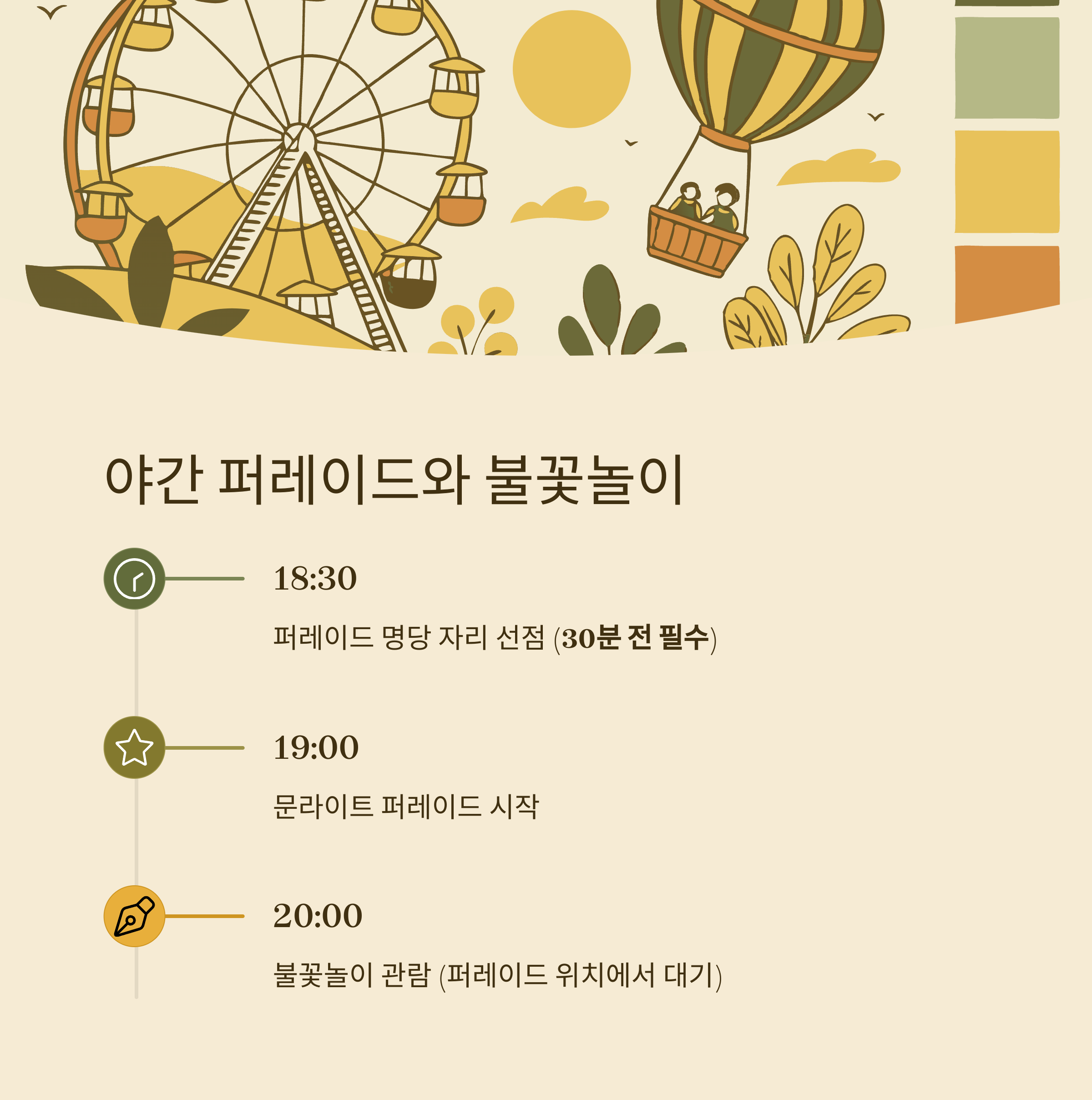 | 19:00~21:00 | 퍼레이드, 불꽃놀이 관람 |