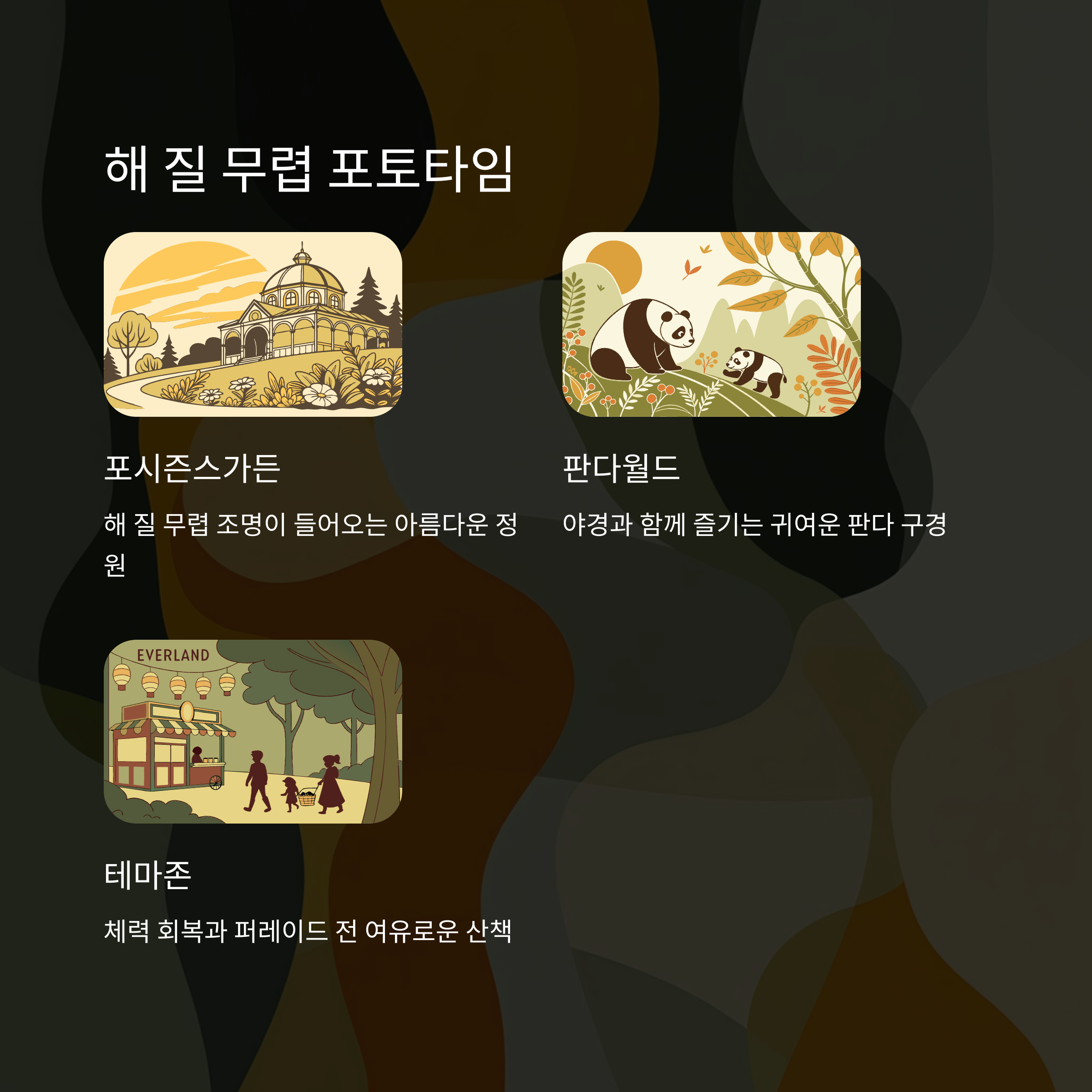 해가 지기 시작하는 오후 6시부터는 포시즌스가든, 판다월드 등 조명이 들어오는 테마존에서