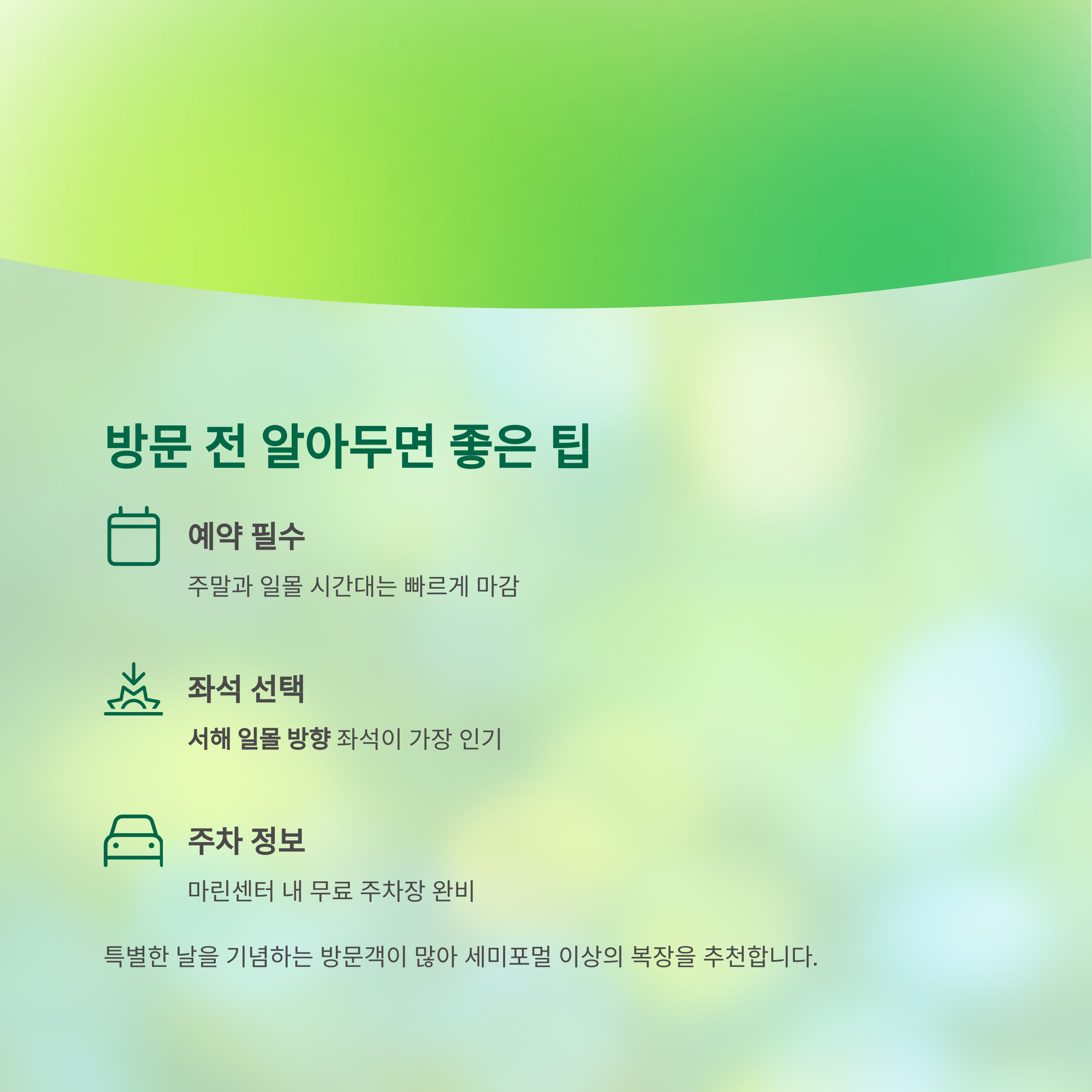 주말이나 일몰 시간대는 예약이 필수입니다.