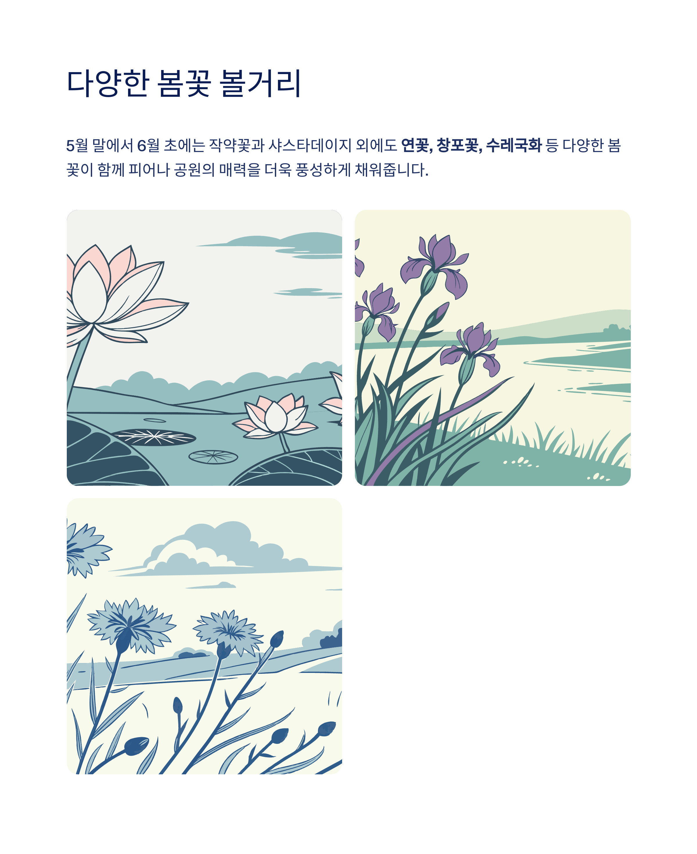 연꽃, 창포꽃, 수레국화 등 다양한 봄꽃이 함께 피어나