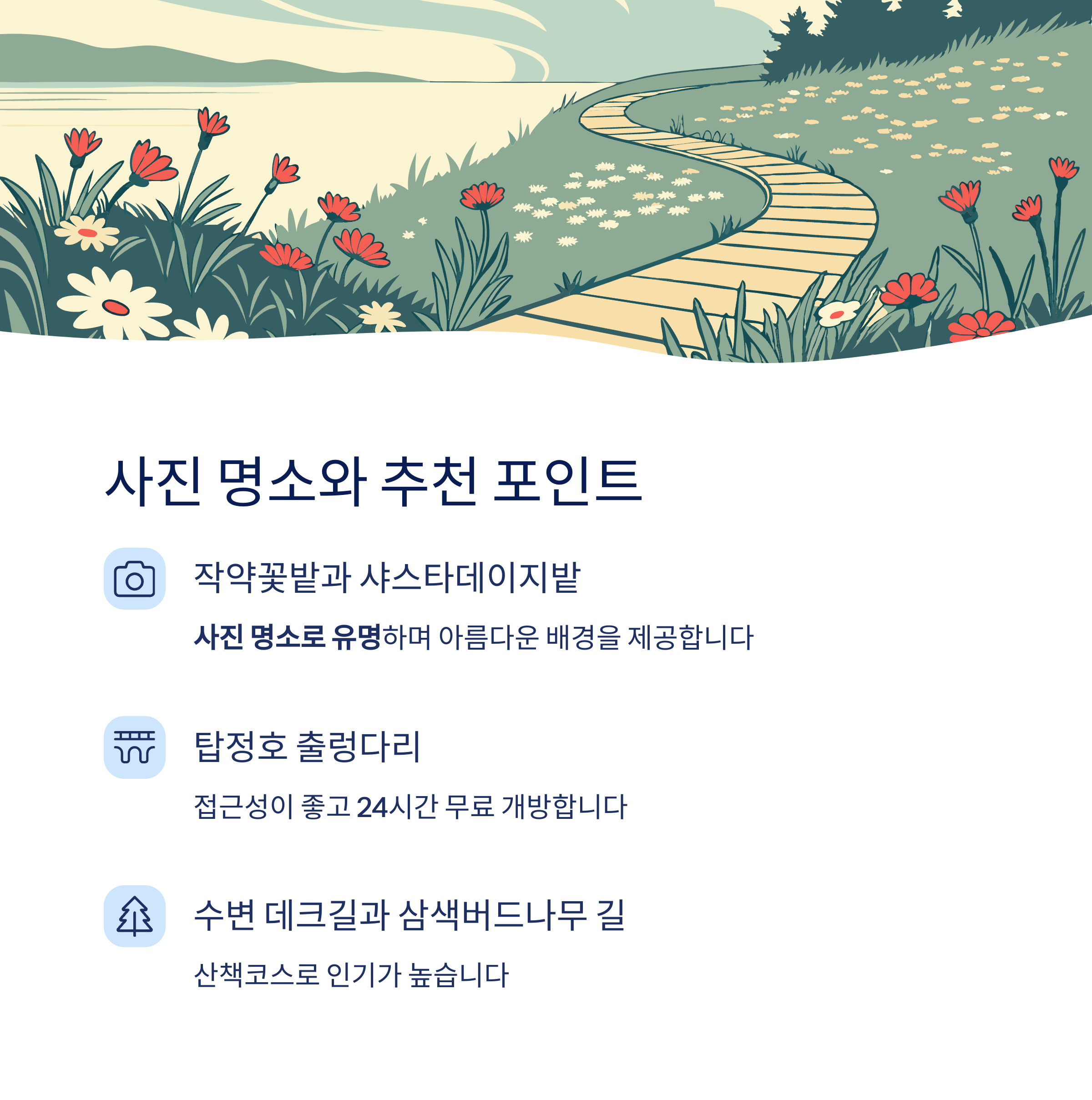 - 최고의 사진 명소: 샤스타데이지밭, 작약꽃밭, 수변 데크길