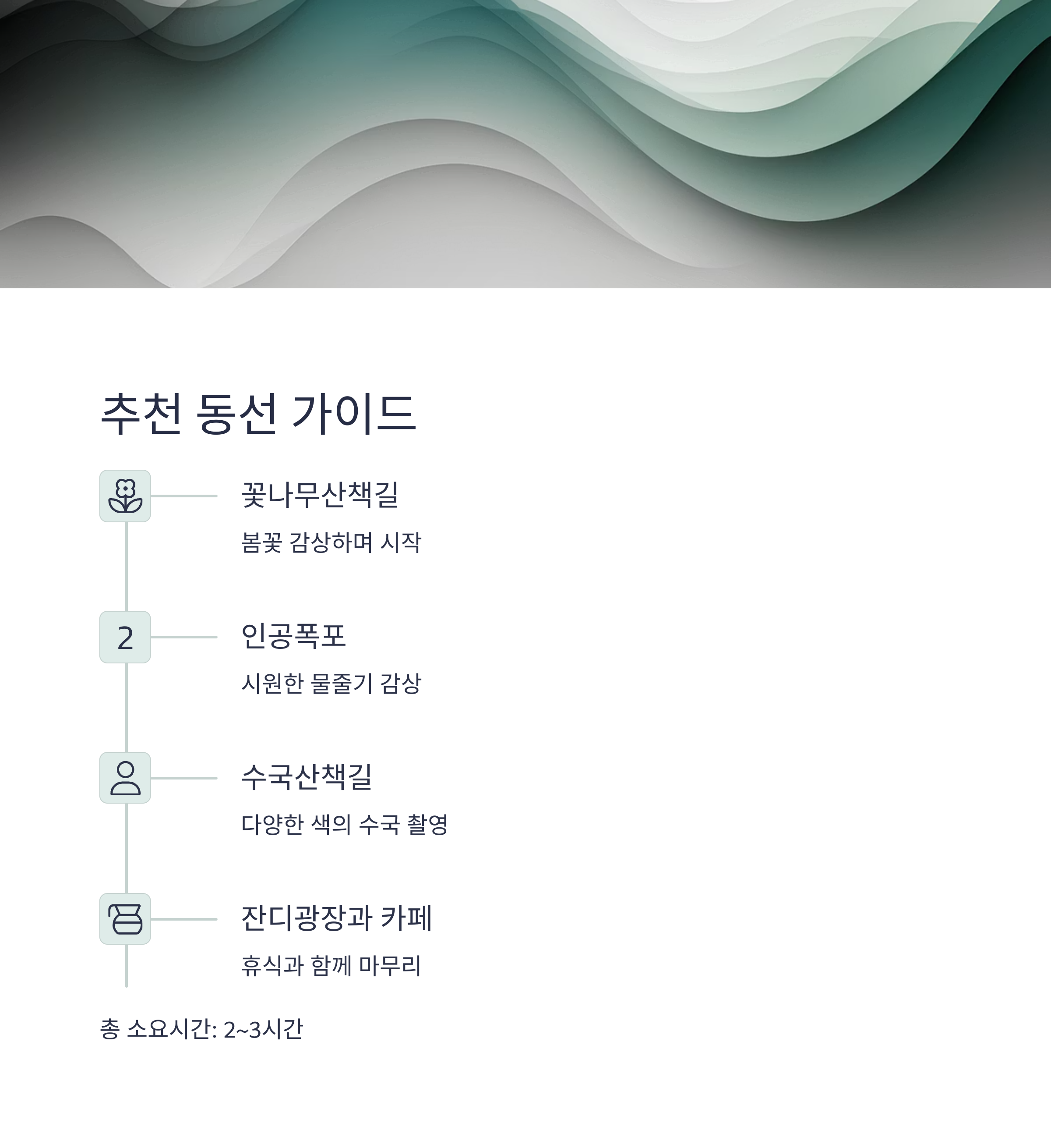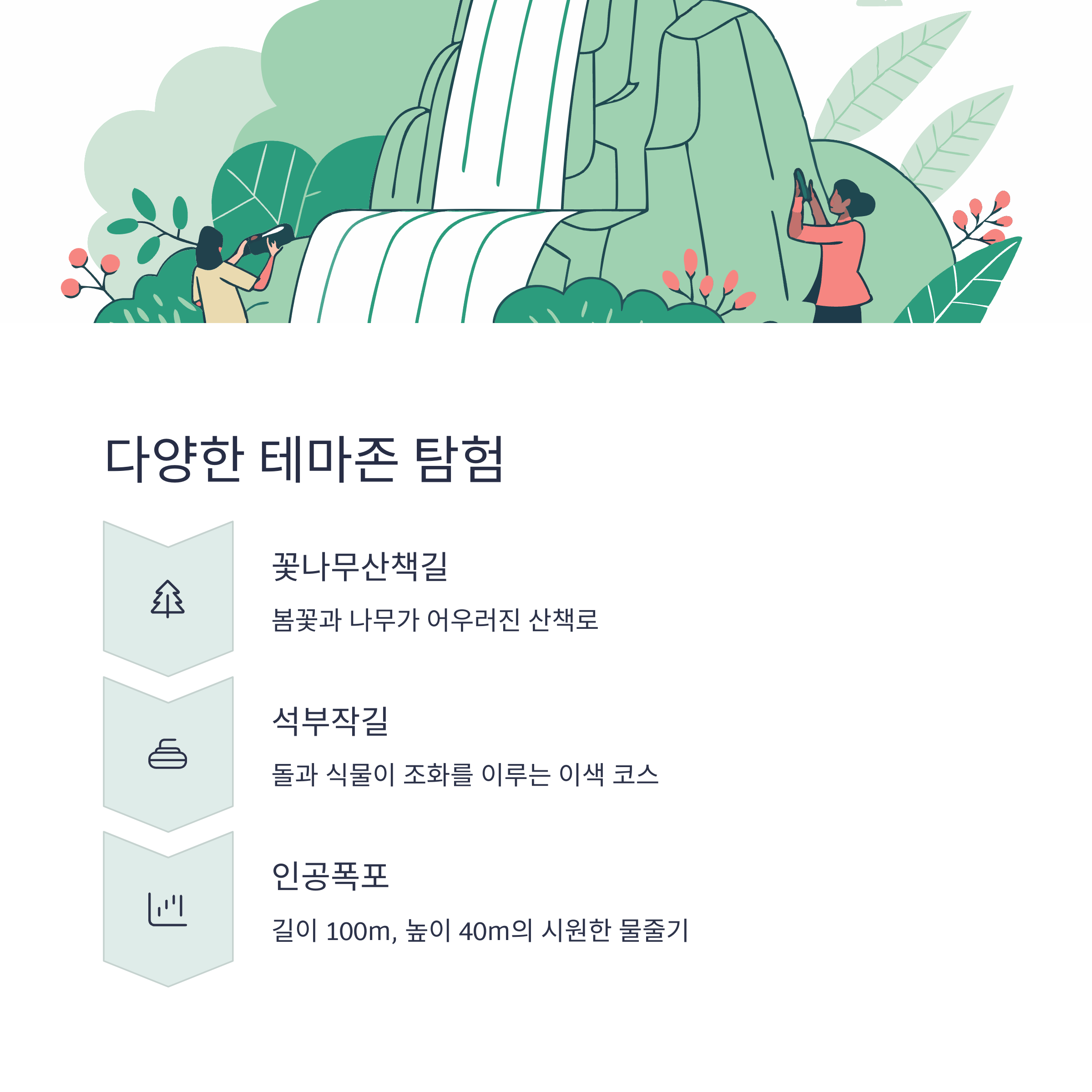 봄꽃과 수국이 어우러진 산책로, 대형 인공폭포, 포토존까지 갖춰