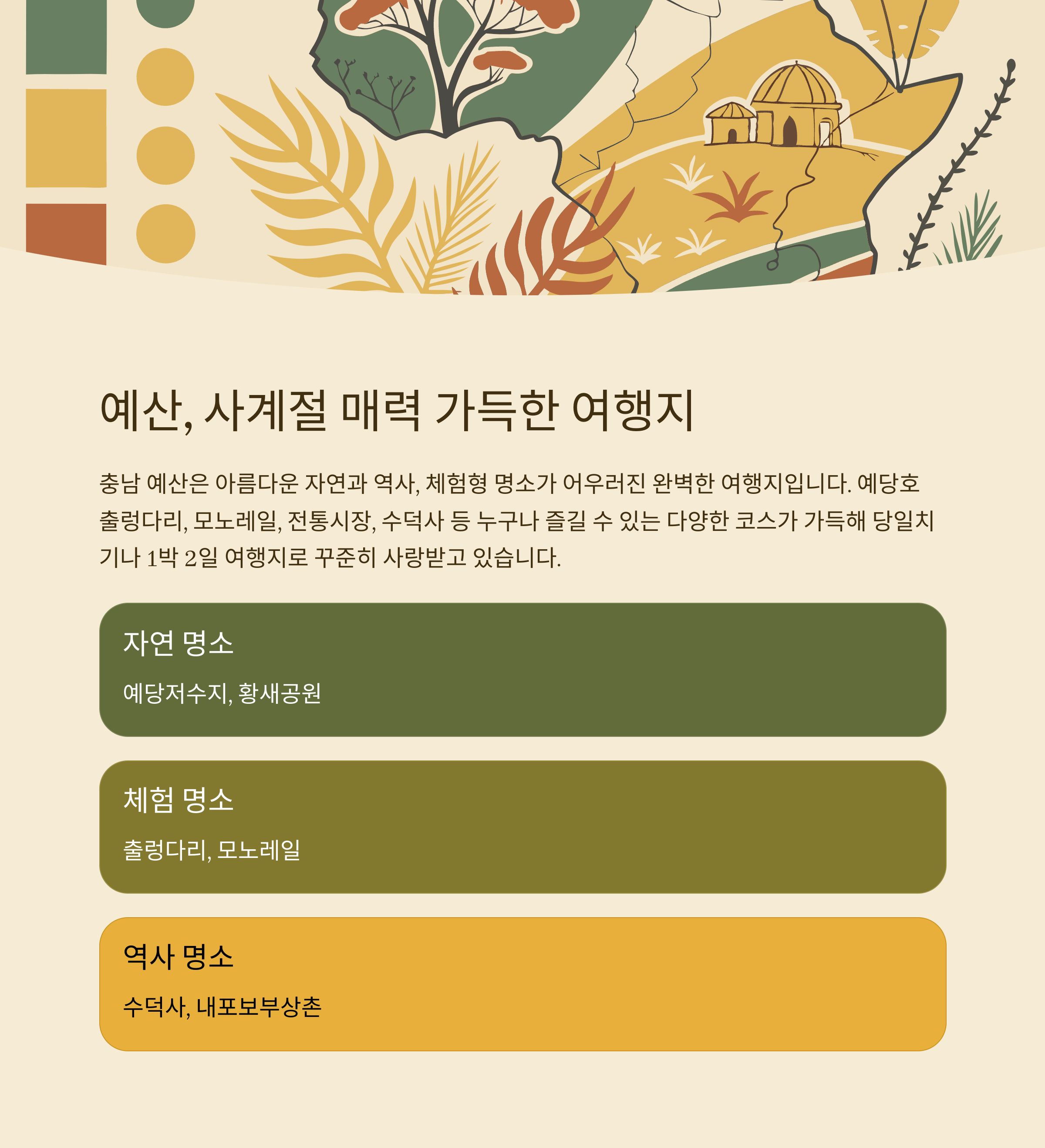 충남 예산은 사계절 아름다운 자연과 역사, 그리고 체험형 명소가 어우러진 여행지입니다.