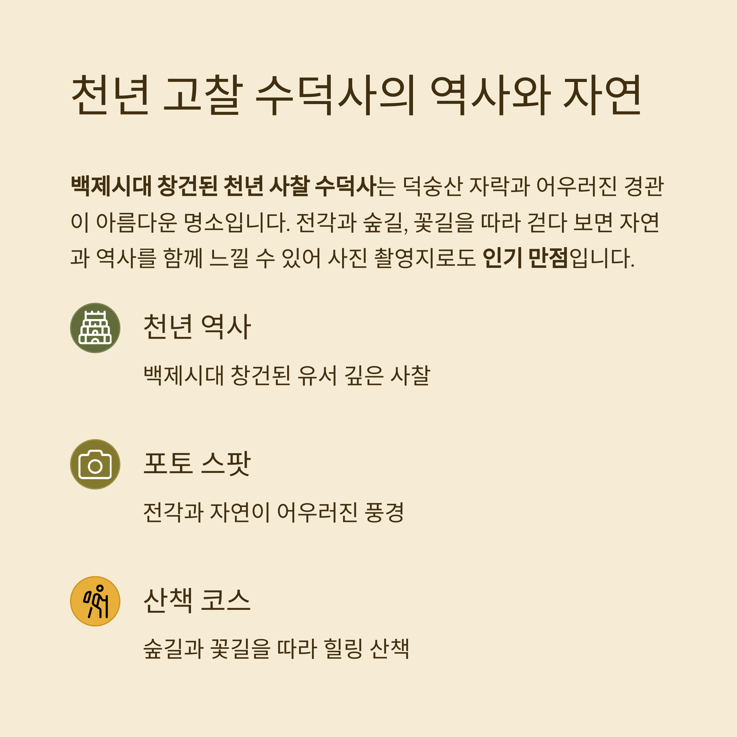 | 5 | 내포보부상촌 또는 수덕사 | 체험형 테마파크, 천년고찰 |