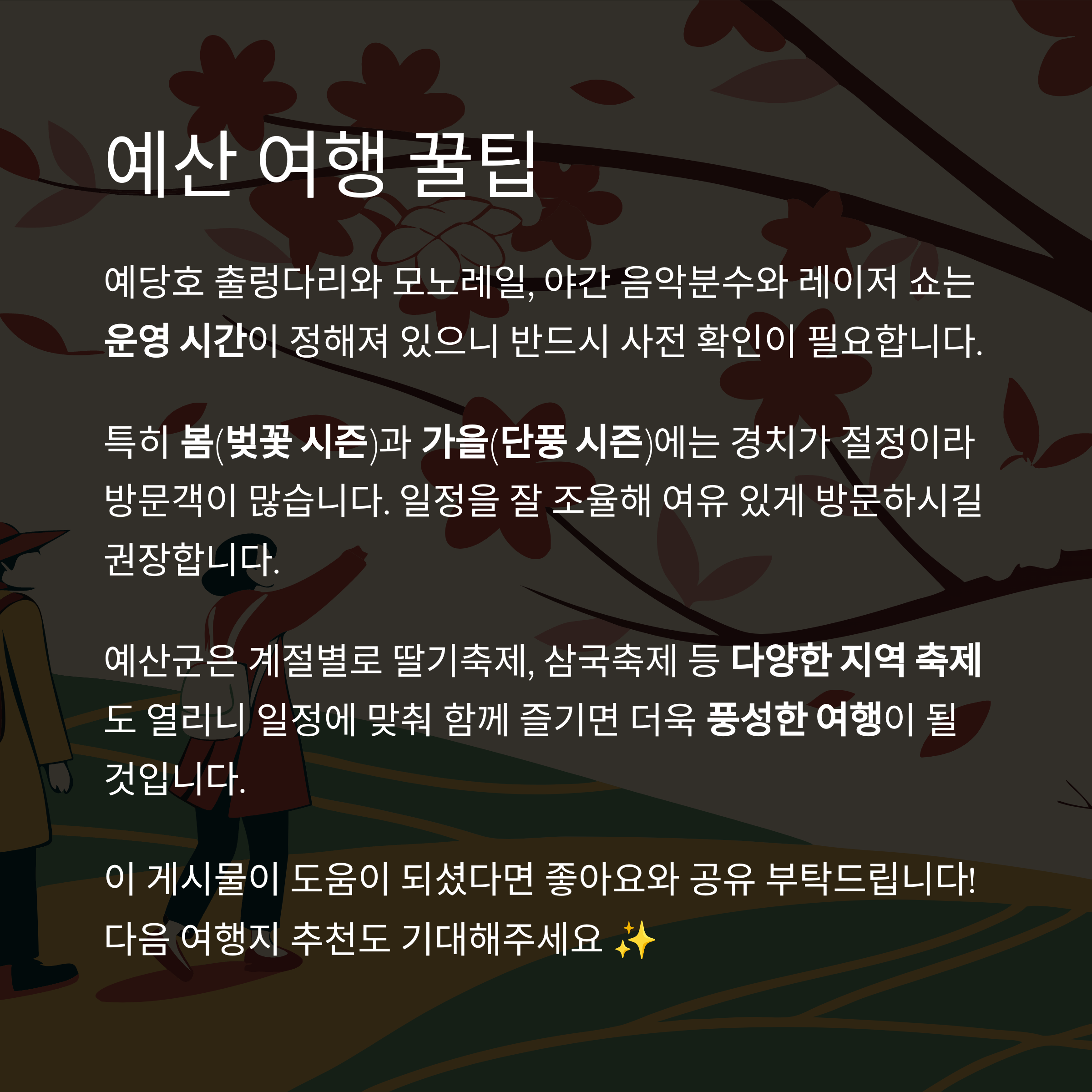 이번 글에서는 예산의 대표 명소와 여행 동선, 꿀팁을 정리해 소개해 드리겠습니다.