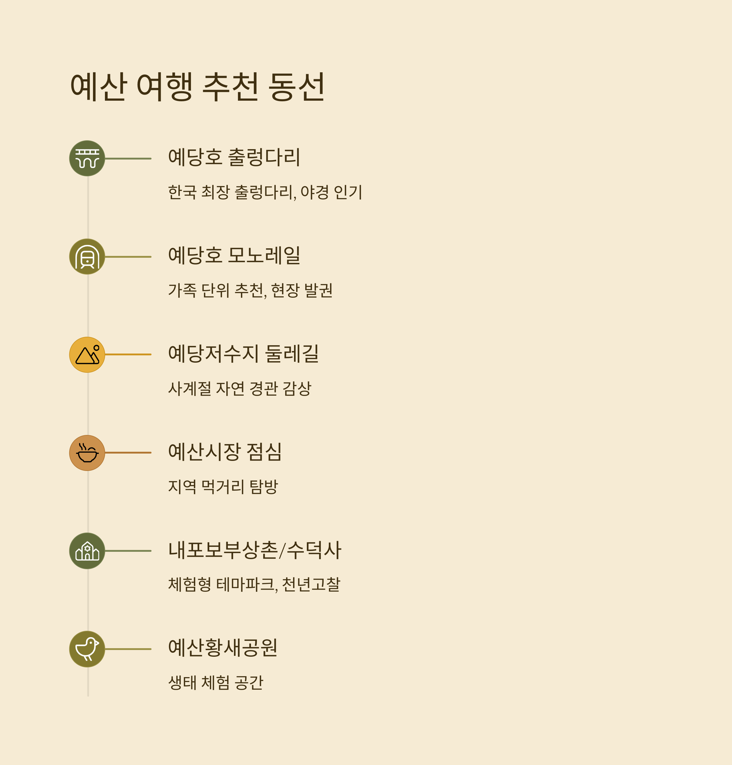 예당호 출렁다리, 모노레일, 전통시장, 수덕사 등 누구나 즐길 수 있는 코스가 가득해