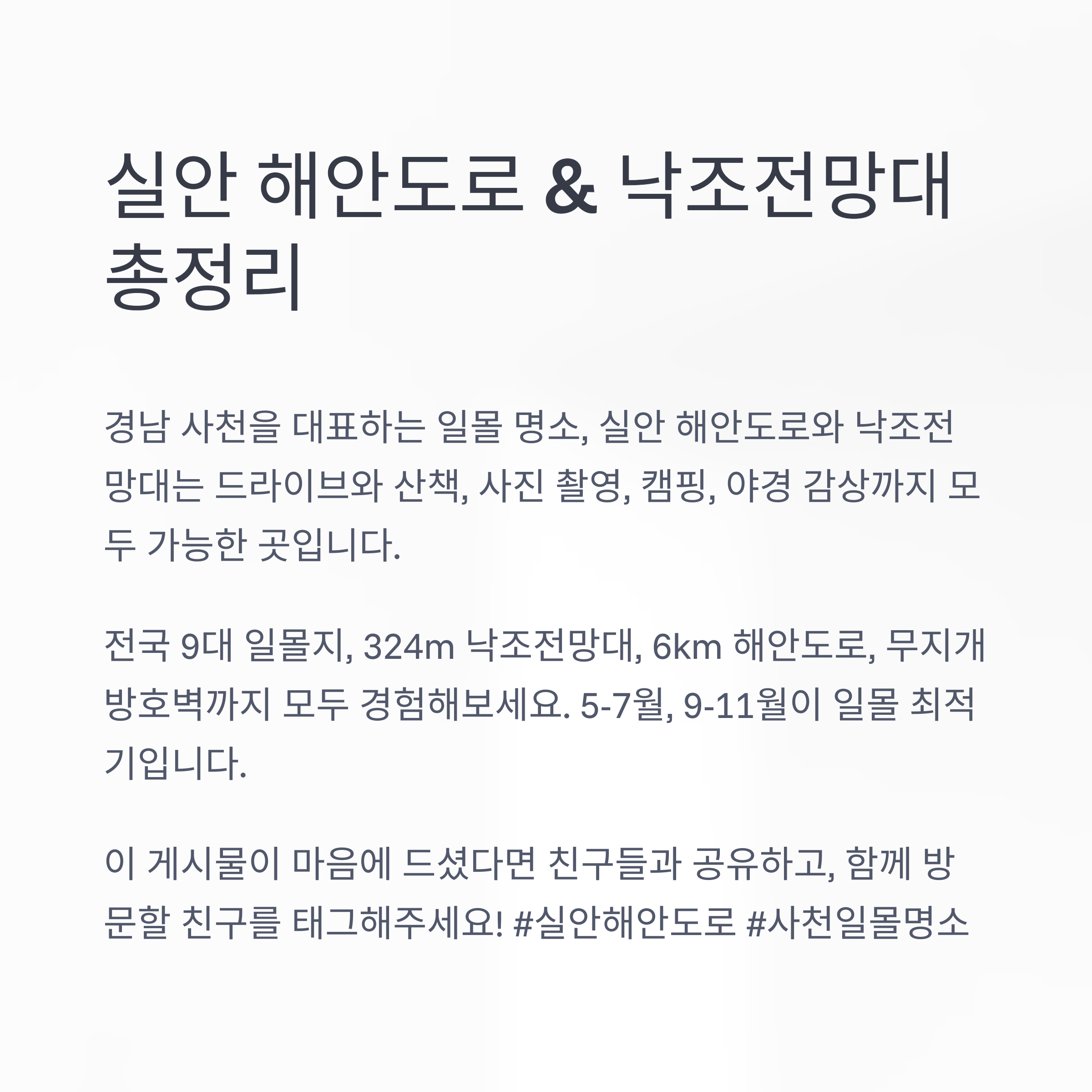 이 글에서는 실안 해안도로와 낙조전망대의 특징, 볼거리, 방문 팁을