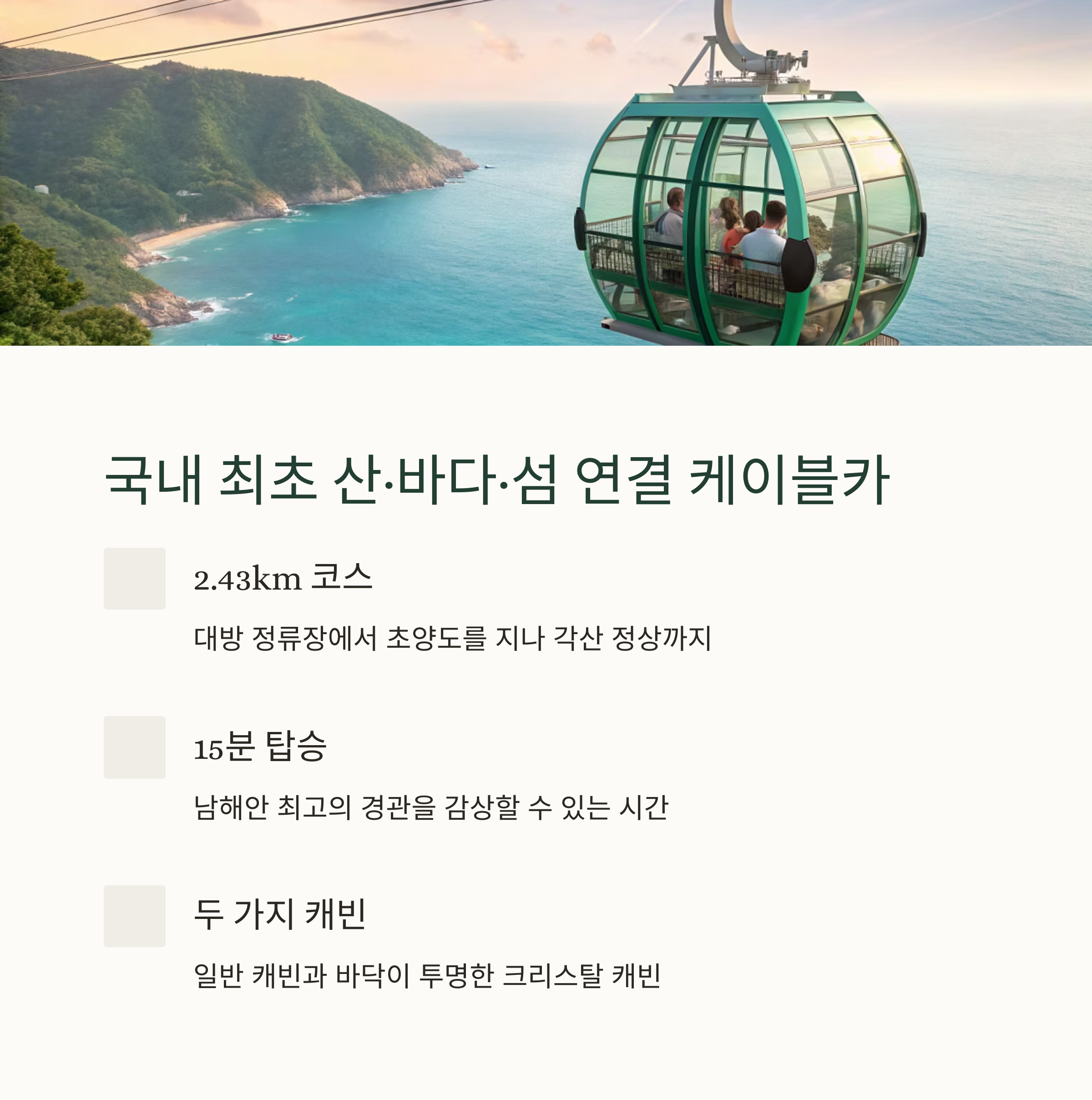 남해안 최고의 경관을 자랑하며, 탑승 시간은 약 15분 정도 소요됩니다.