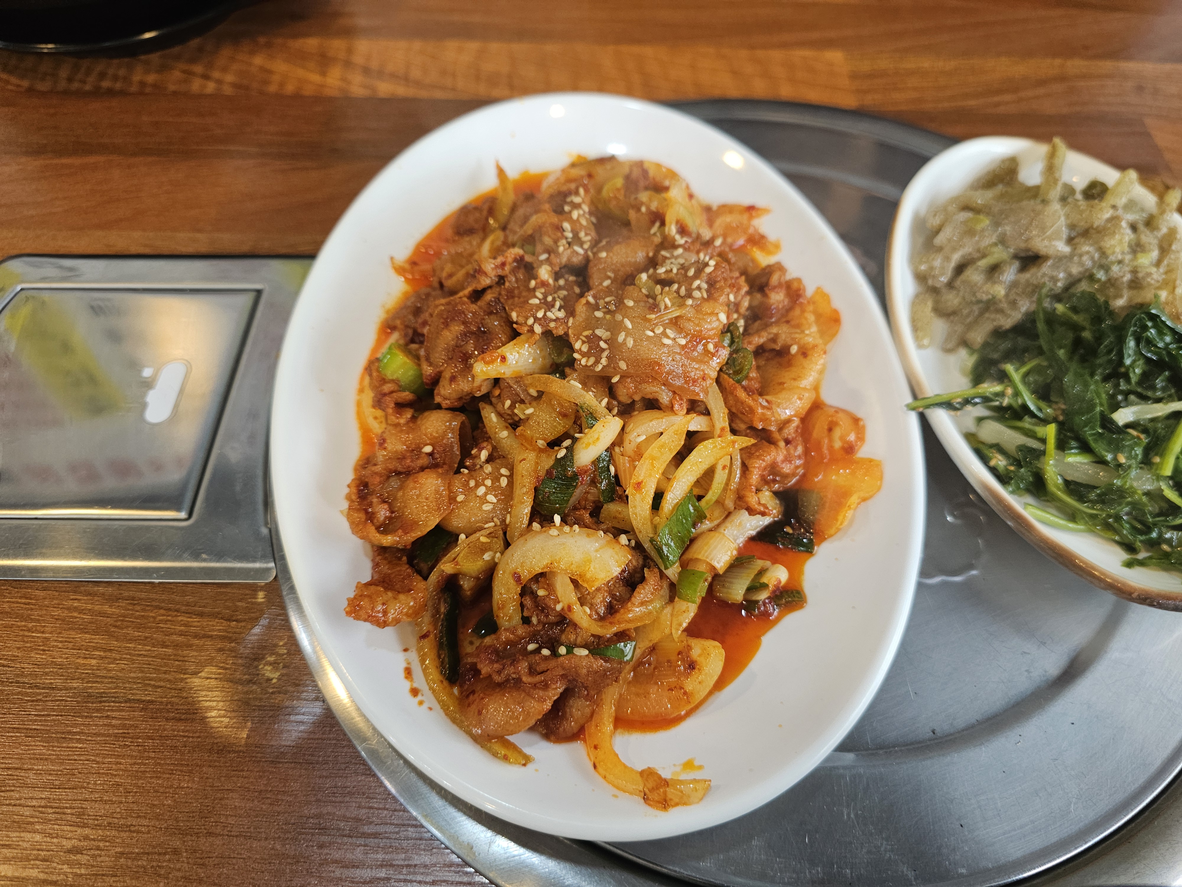 이번 방문에서는 제육볶음과 조기구이, 그리고 기본 제공되는 청국장과 반찬까지