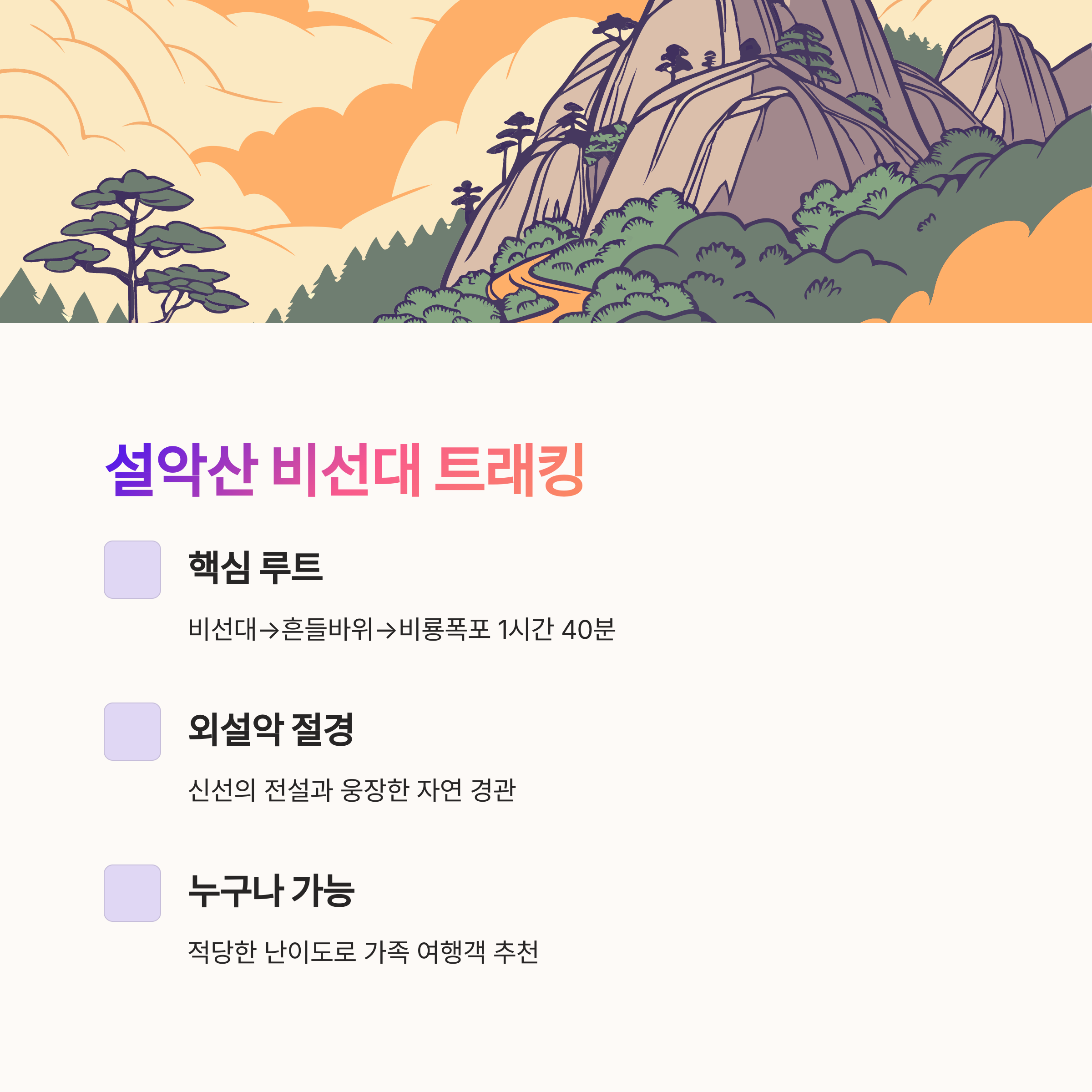 | 1일차 오전 | 설악산 비선대~비룡폭포 | 트래킹과 외설악 절경 | 약 1시간 40분 |