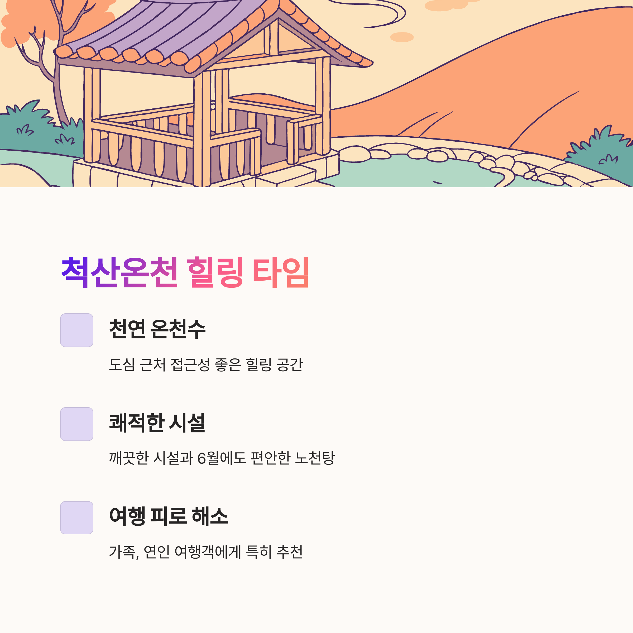 | 1일차 저녁 | 척산온천 | 천연 온천 힐링 | 1~2시간 / 12,000원 |