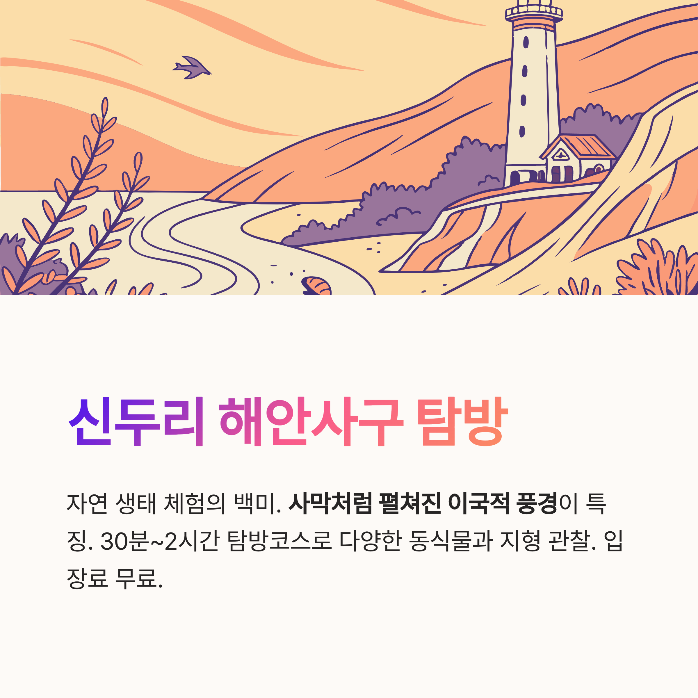 • 국내 최대 사구지대와 연꽃 가득한 수목원이 만드는 특별한 자연 체험