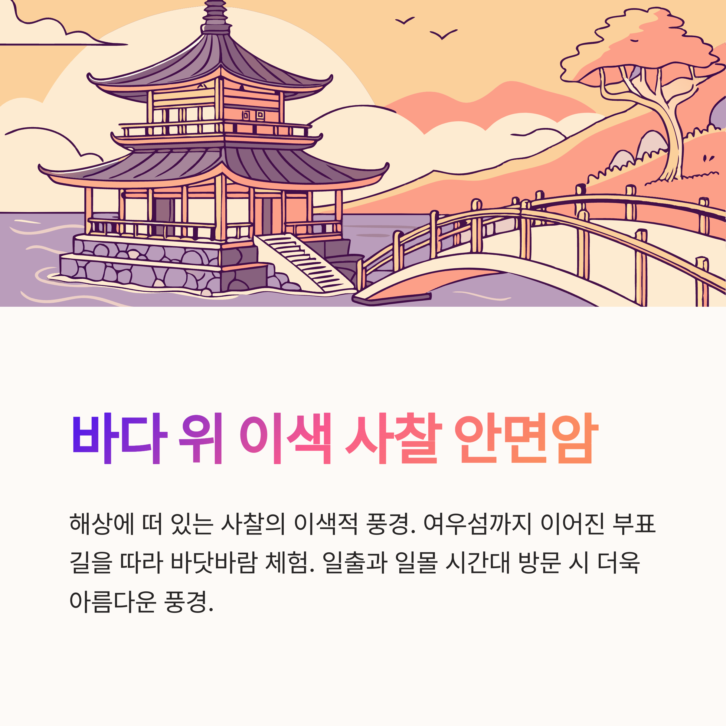 해상에 떠 있는 사찰이라는 이색적인 풍경을 자랑하는 안면암은 체험의 재미도 큽니다.