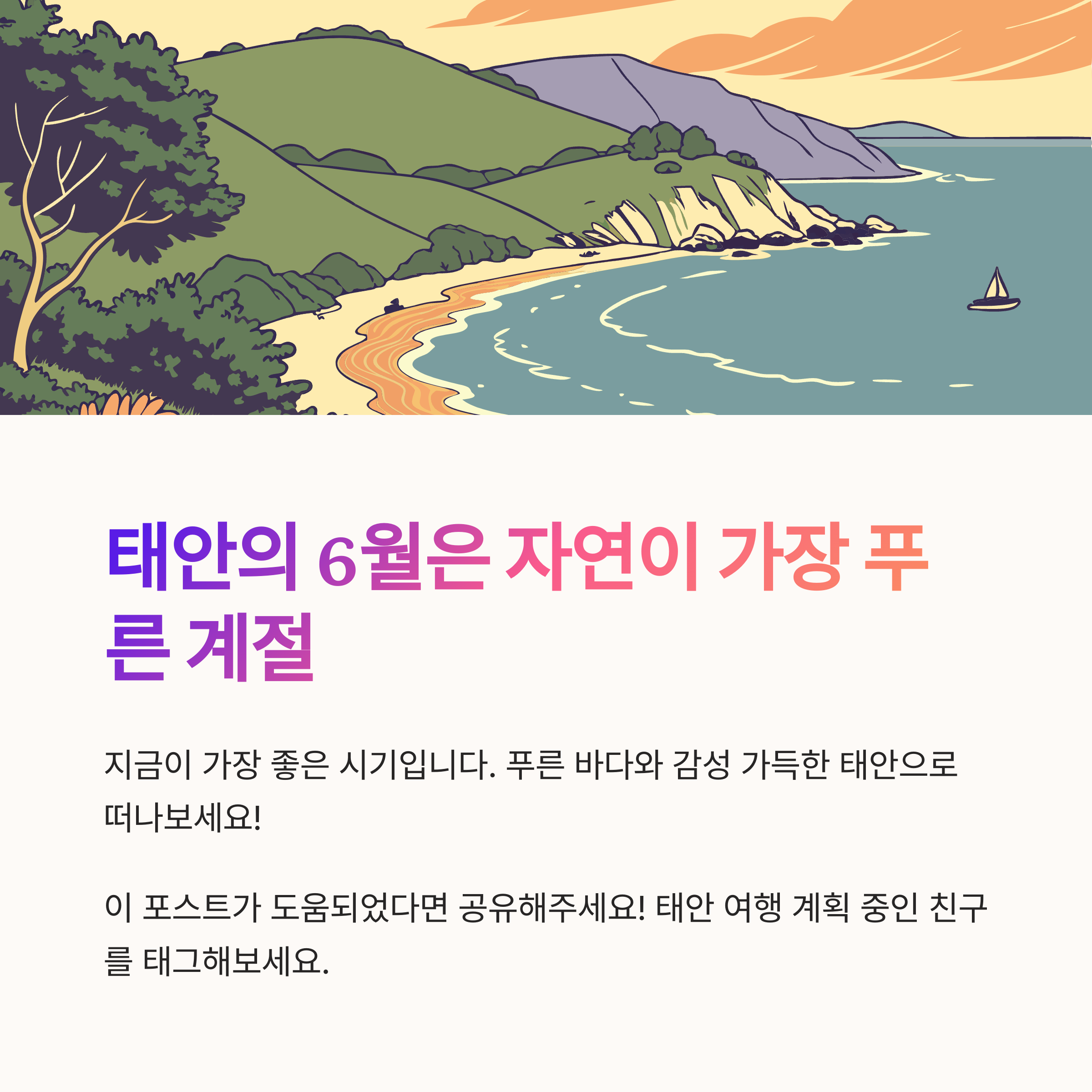 6월은 특히 해변과 수목원이 아름다운 시기로, 연인·가족·혼행 모두에게 추천할 만한 최적의 시기입니다.
