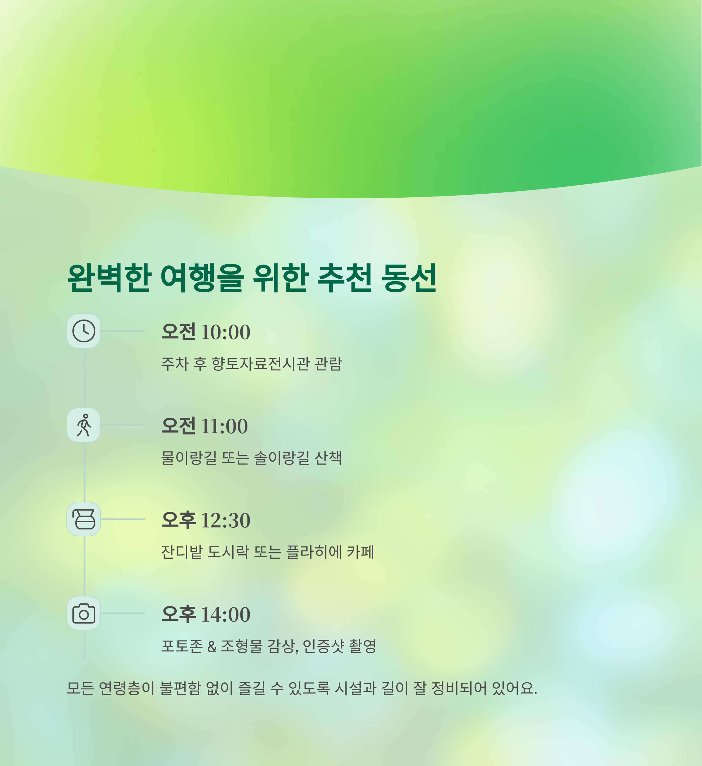 | 오전 11:00 | 물이랑길 또는 솔이랑길 산책 |