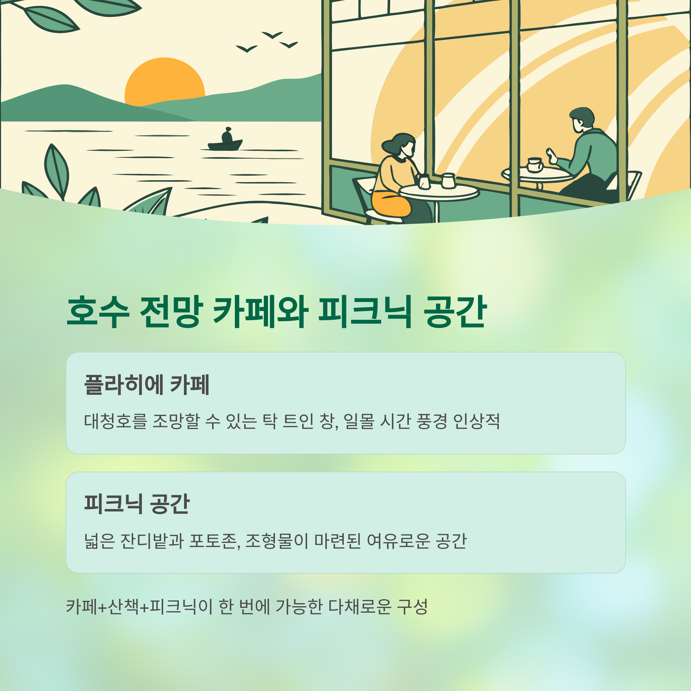 호수를 마주한 감성 카페와 여유로운 피크닉 공간