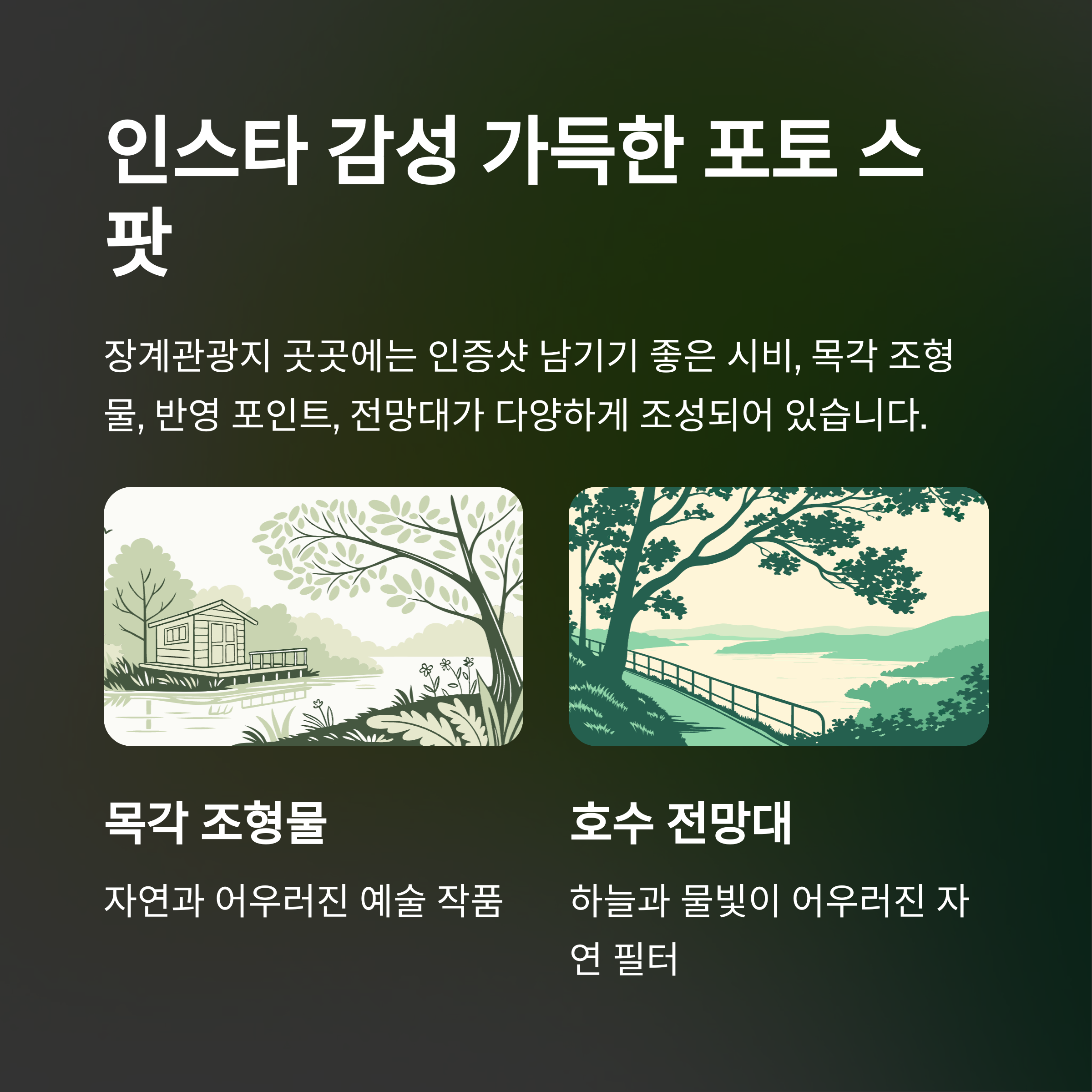 장계관광지 곳곳에는 시비, 목각 조형물, 반영 포인트, 전망대 등
