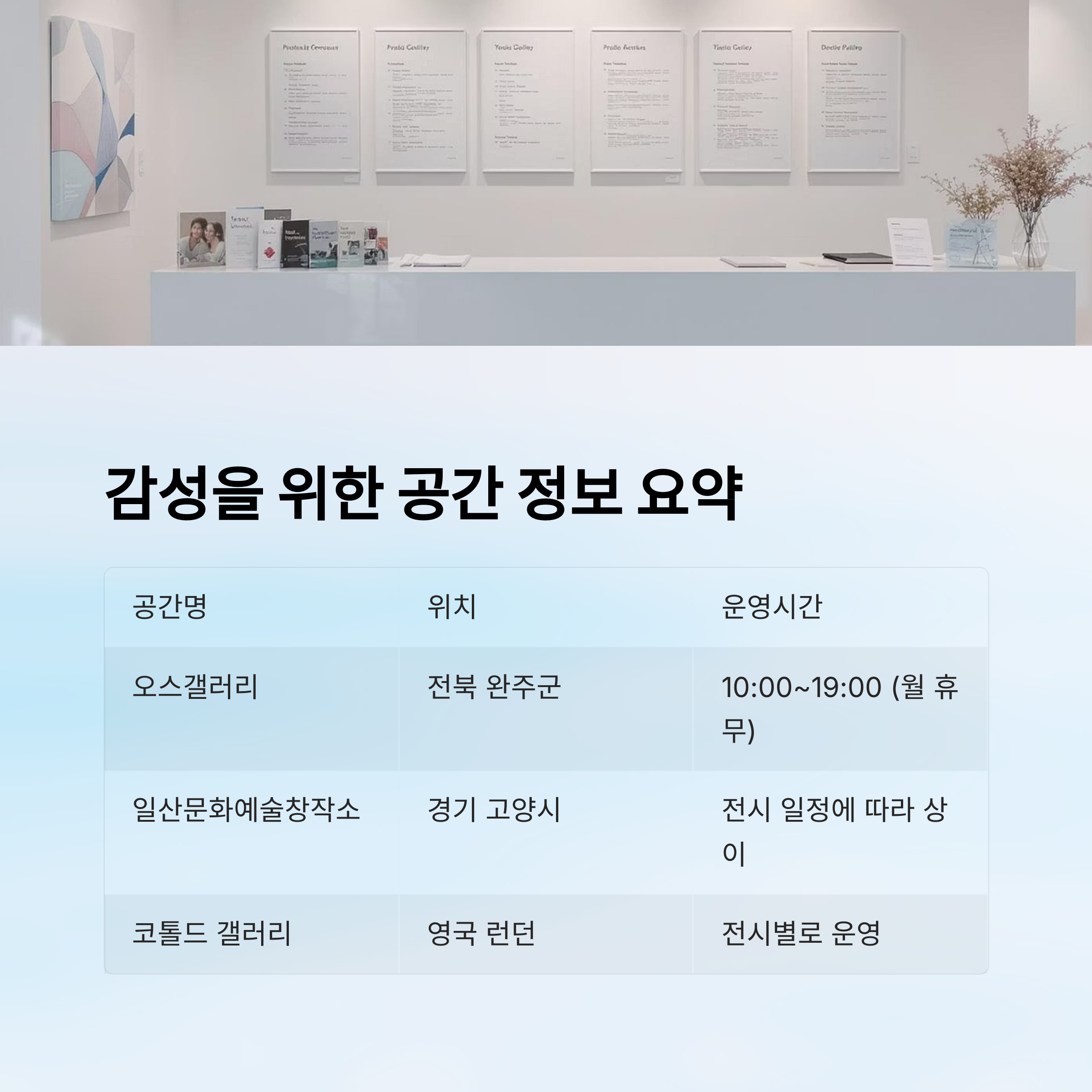 | 오스갤러리 | 전북 완주군 구이면 덕천산성길 65 | 10:00~19:00 (월 휴무) | 자연·건축·예술의 조화, 계절별 전시, 조용한 카페 분위기 | 계절별 테마 전시, 수제청·전통차 제공 |