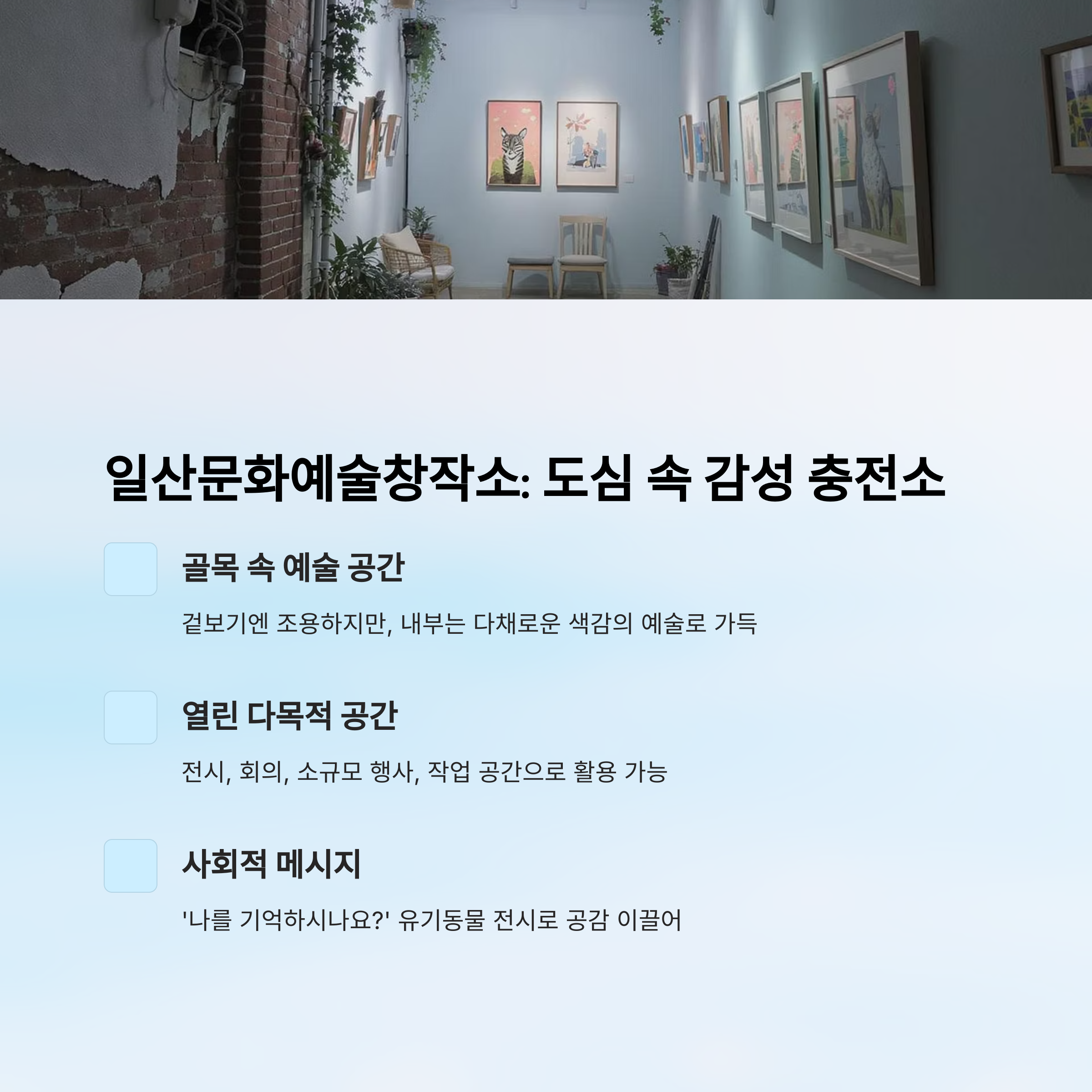 | 일산문화예술창작소 | 경기 고양시 일산역 인근 | 전시 일정에 따라 상이 | 도시 속 조용한 골목, 열린 공간, 다양한 예술 전시 | '나를 기억하시나요?' 유기동물 전시 |